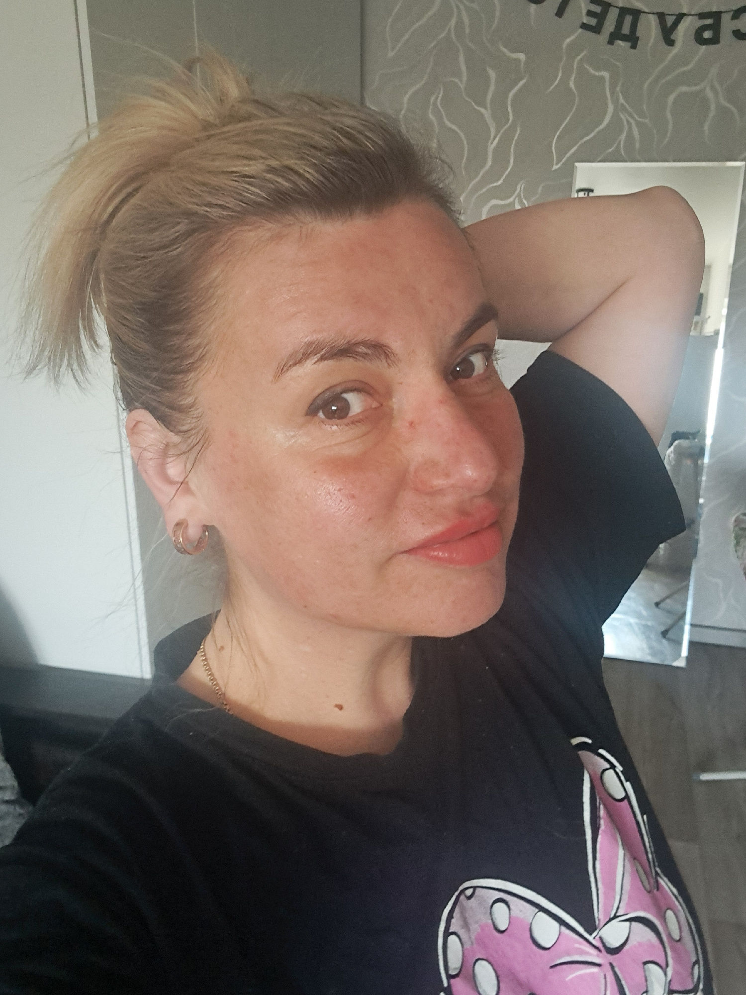 A portrait-oriented image captures a fair-skinned individual, likely female, with her head positioned on the left side of the frame. She looks upwards and directly at the camera with prominent brown e…read more
