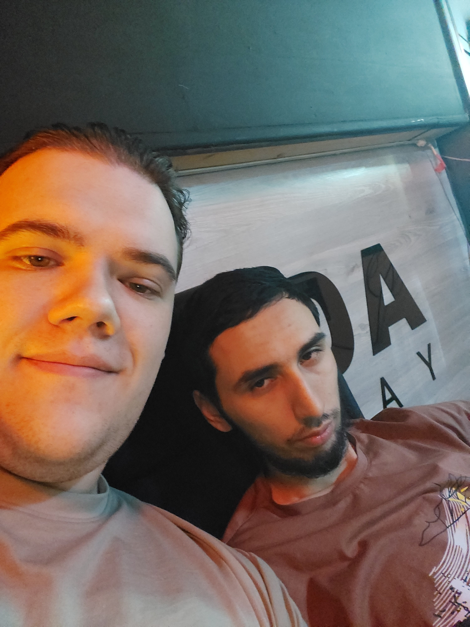 Two men are visible in the image. The man at the top of the image is fair-skinned, has short dark hair, and is wearing a light-colored t-shirt. He is looking at the camera and has a slight smile. The…read more