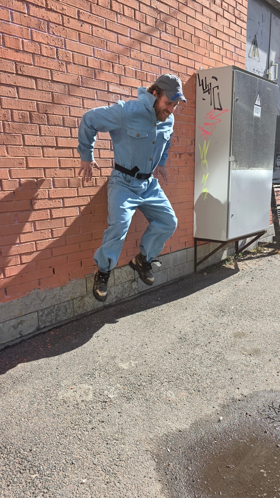 The image displays an optical illusion photograph of a man posing in an urban outdoor environment in Saint Petersburg, Russia. The photo is rotated 90 degrees clockwise, making the man appear to be st…read more