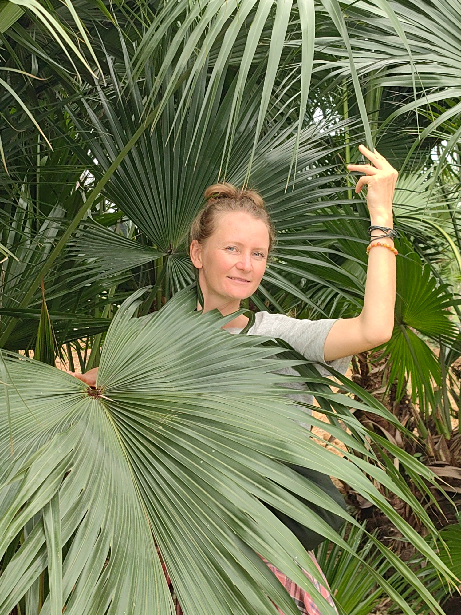 In Bai Chay Ward, Vietnam, a woman is centrally framed amidst dense palm fronds. She is fair-skinned with her hair pulled back in a bun, wearing a grey shirt and wrist bracelets. Her right arm is rais…read more