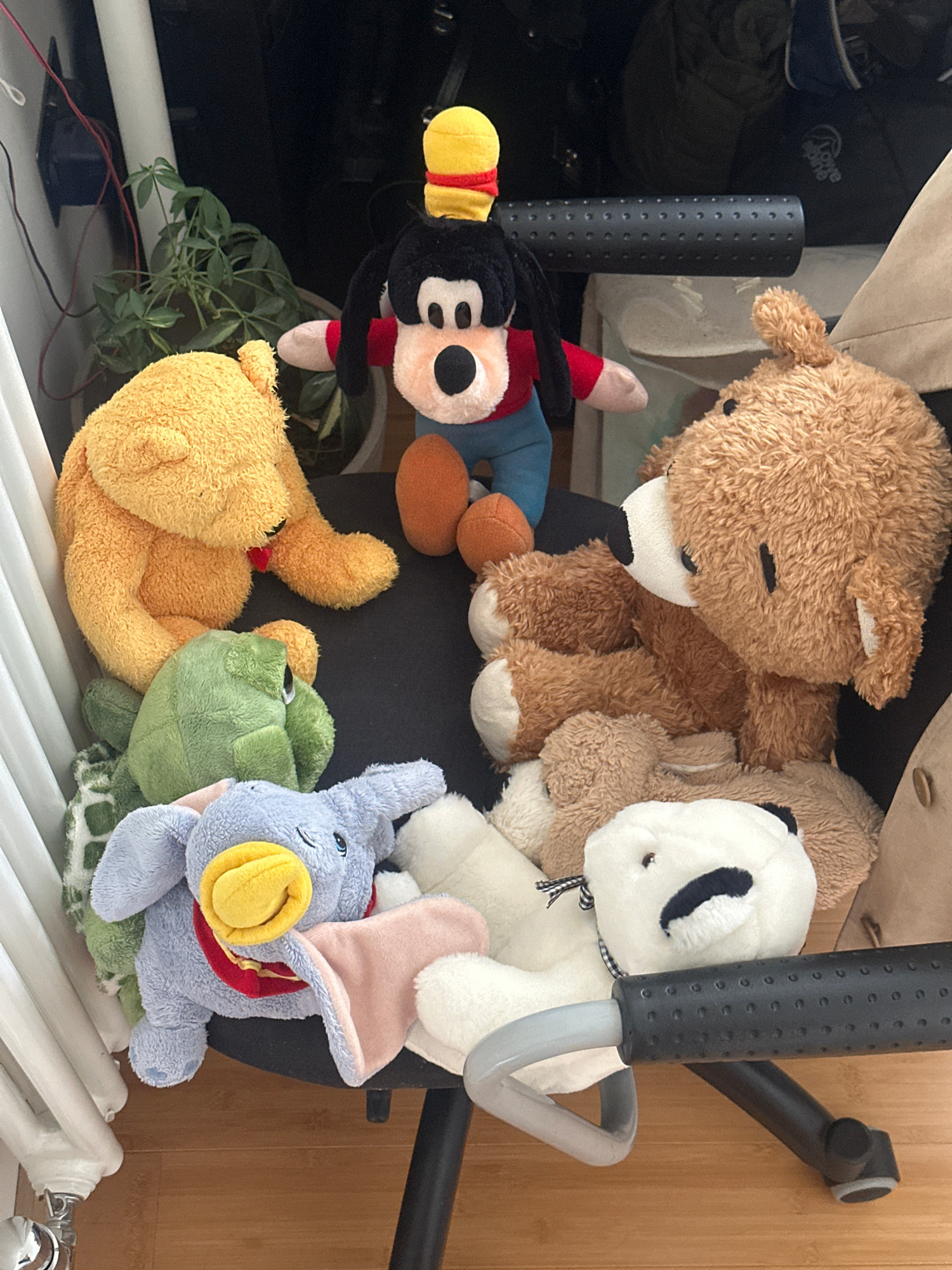 The image depicts a collection of plush toys piled on a white radiator and partially obscured by a black office chair. The toys include a brown bear, a panda, Mickey Mouse, Winnie the Pooh, a green tu…read more