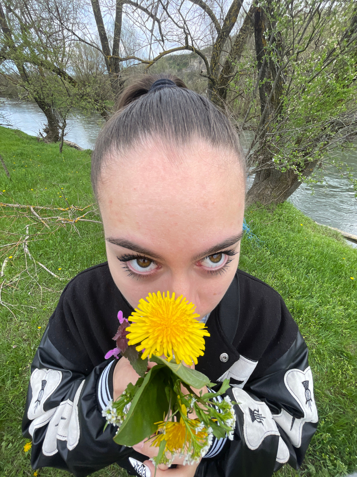 A young person with brown eyes and dark eyelashes is holding a small bouquet of dandelions and white wildflowers in front of their face. They are wearing a black bomber jacket with white designs on th…read more