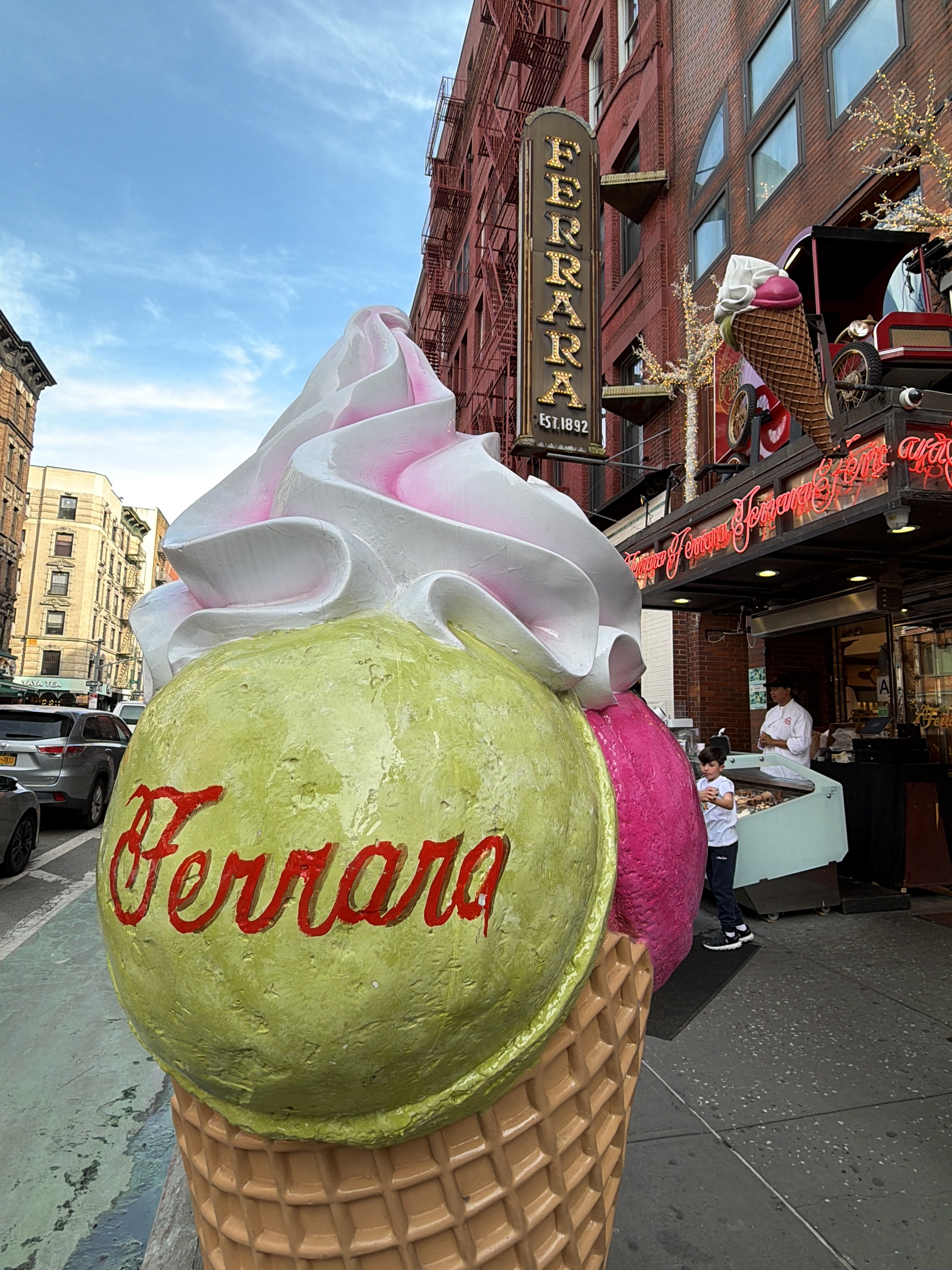 The photograph depicts a large, colorful ice cream cone sculpture in front of Ferrara Bakery & Cafe, located in the Little Italy neighborhood of New York City. The sculpture has three scoops of ice cr…read more