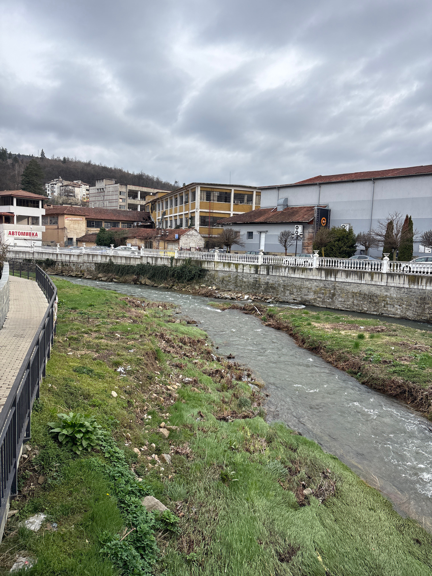 The image depicts a waterway running through the city of Tryavna, Bulgaria, adjacent to a complex of buildings and infrastructure. A waterway, possibly a canalized river or stream, cuts through the sc…read more