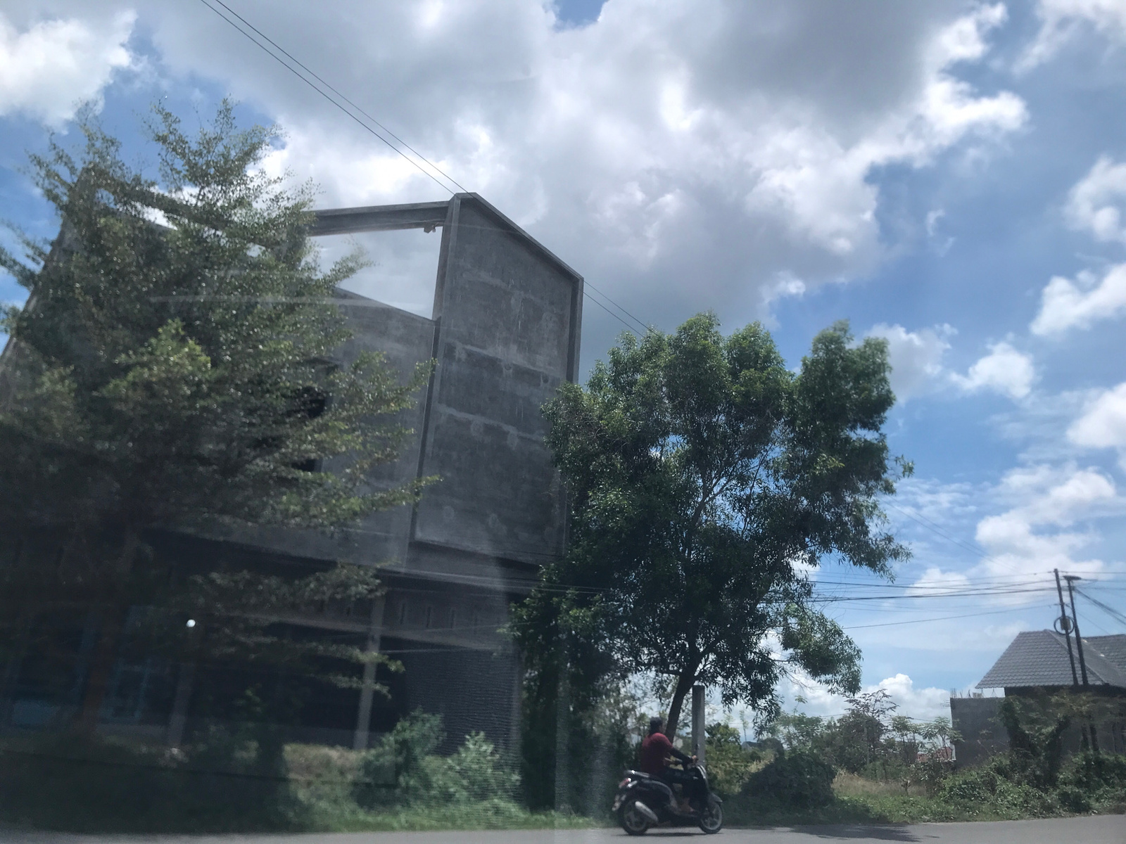 A medium, eye-level shot taken from inside a vehicle on a road reveals a partially constructed, unfinished grey concrete building adjacent to a tree obscuring part of the facade. To the right of the b…read more