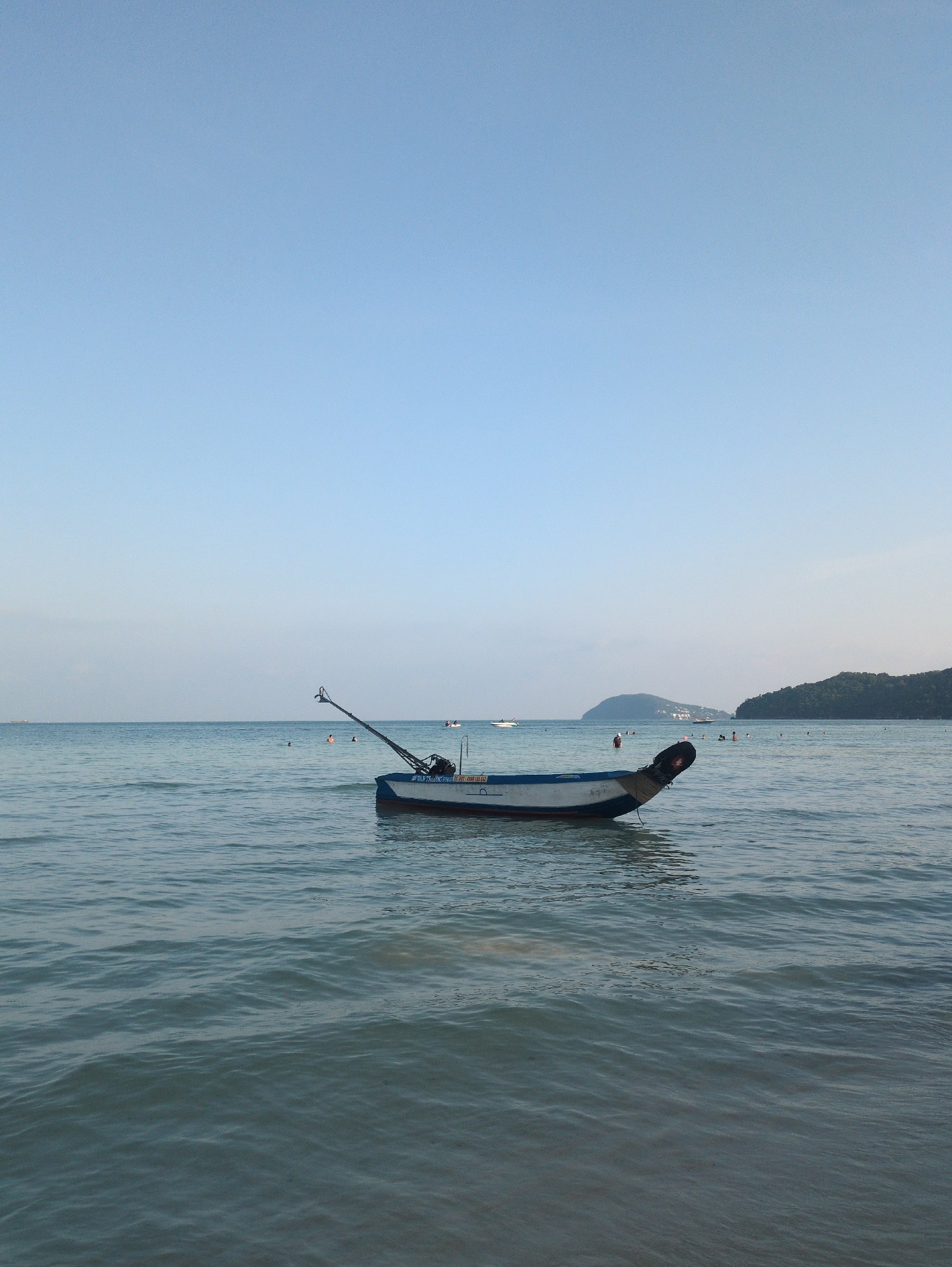 The image shows a partially submerged longtail boat in the shallow waters off a beach in Phú Quốc, Vietnam. The boat is positioned at an angle to the shore, with its bow pointing towards the beach. Th…read more