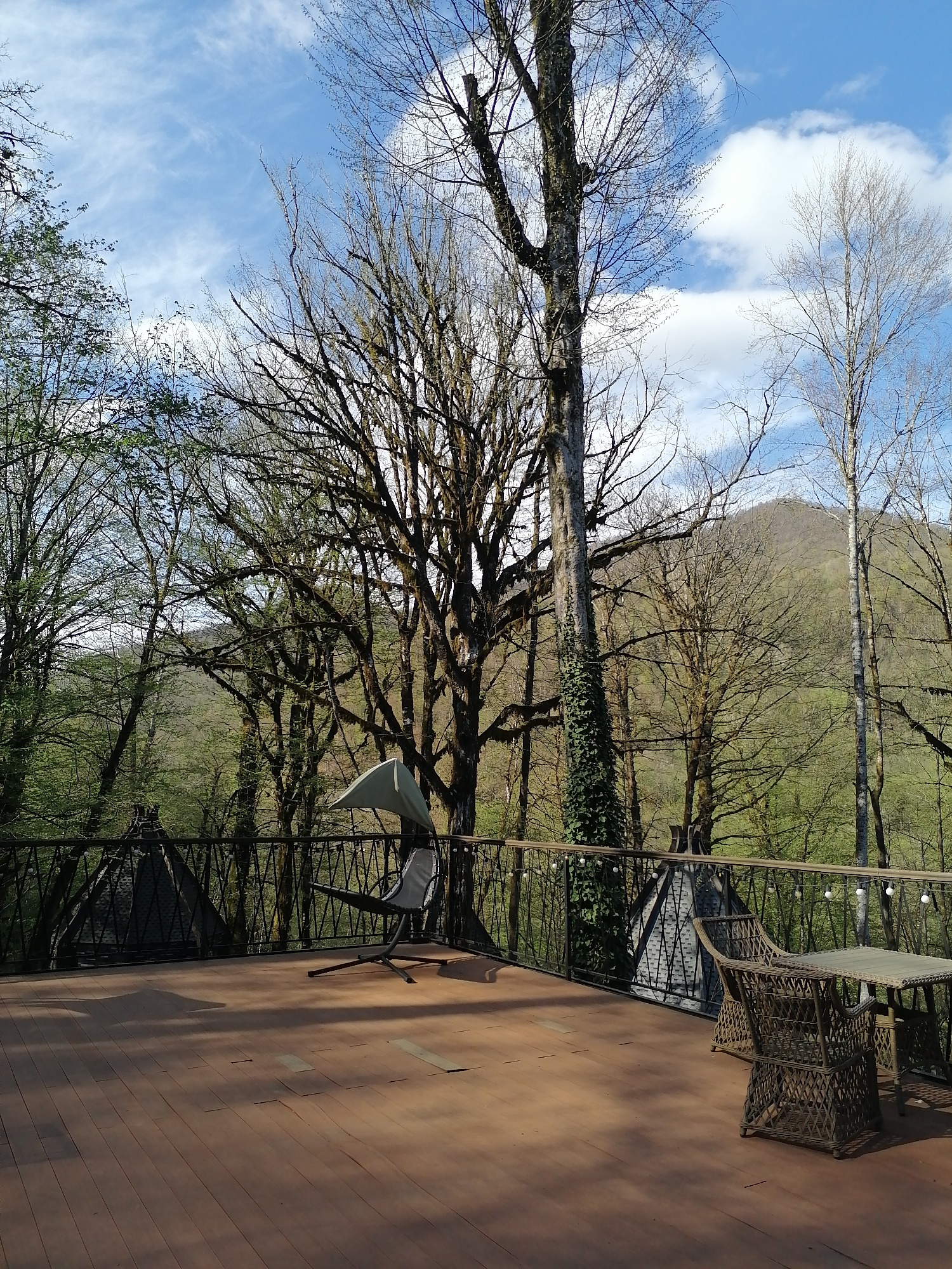 The image captures an expansive outdoor wooden deck offering a panoramic view of a lush, forested mountainous landscape. The deck, constructed from reddish-brown planks, dominates the foreground, lead…read more