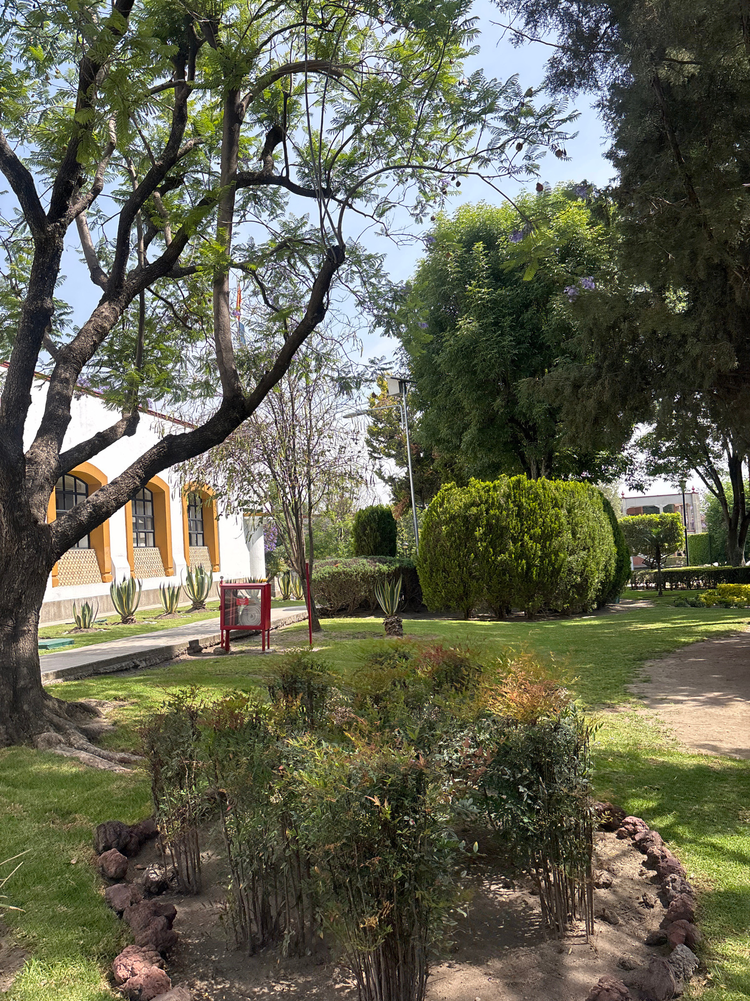 The image shows a park scene in San Andrés Cholula, Mexico. A large tree with green leaves and thick branches dominates the foreground. Behind the tree, a white building with arched windows and orange…read more