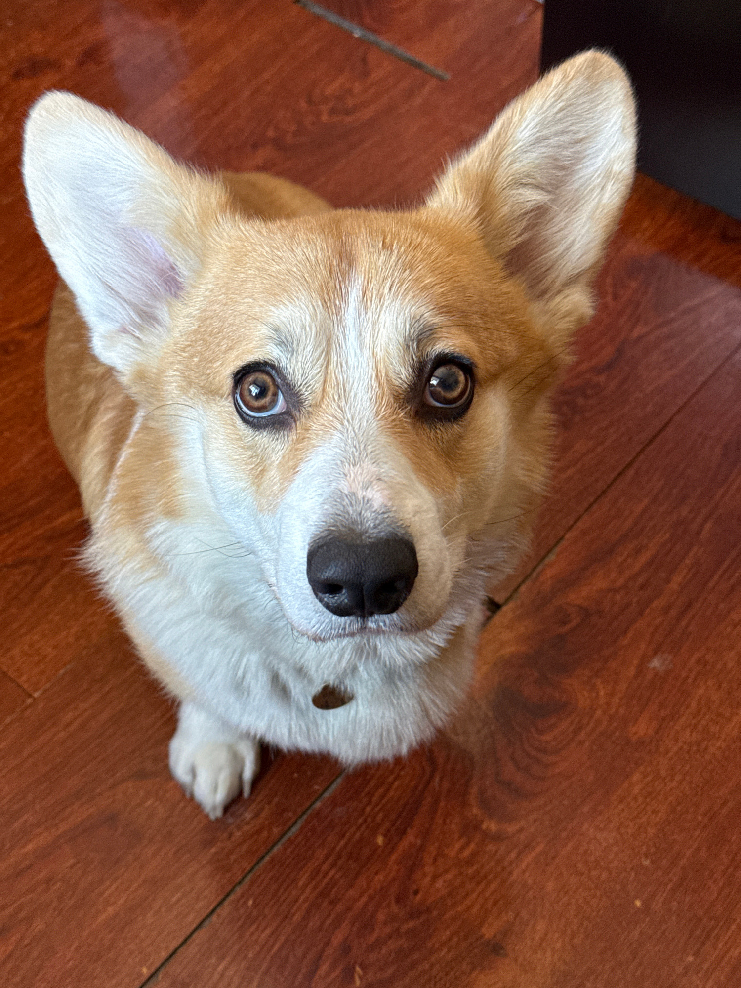 A medium-sized dog, a Corgi, lies on a wooden floor. The dog is light brown and white with upright ears and dark brown eyes, looking directly at the camera. The floor has a wood-grain pattern. The loc…read more