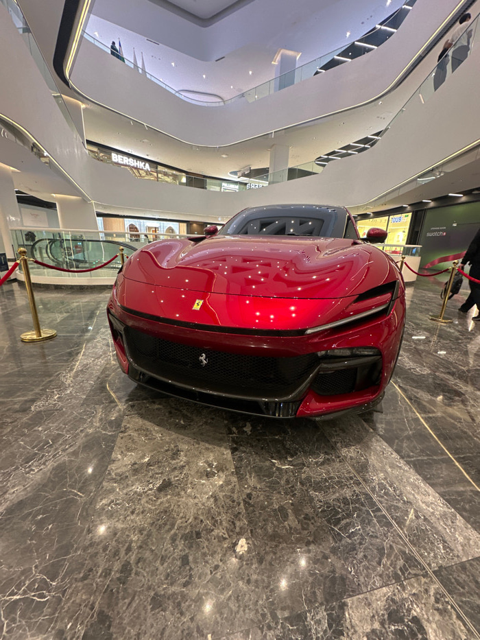 A metallic red Ferrari sports car is centrally displayed on a dark grey, polished marble floor within a multi-level modern shopping mall in Tashkent, Uzbekistan. The vehicle is cordoned off by golden…read more