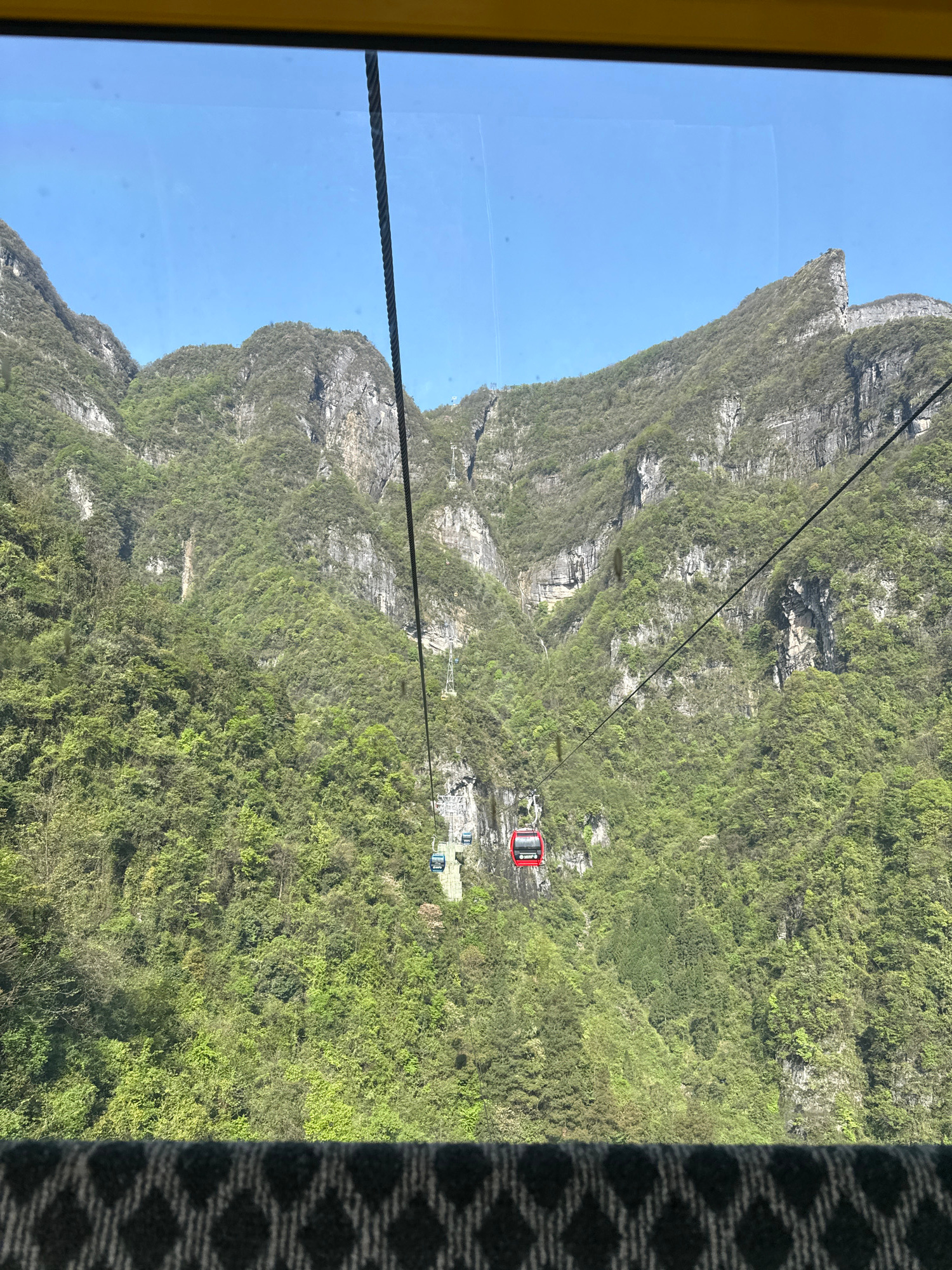 The media file presents a scenic view of a mountainous landscape, captured from inside a cable car. The perspective shows a yellow frame of the cable car window on the left side, and a dark patterned…read more