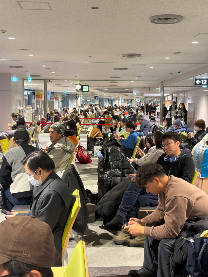 A densely crowded indoor waiting area, identified as being within New Chitose Airport in Chitose, Japan. Numerous individuals, primarily of East Asian descent, are seated on rows of modular chairs fea…read more