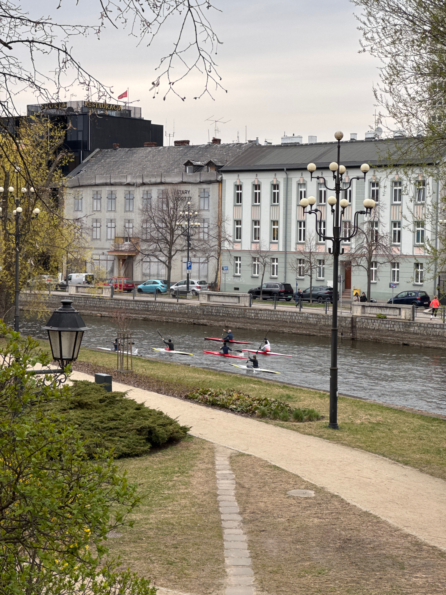 The image shows a canal in Bydgoszcz, Poland. The canal is flanked by buildings on one side and a grassy park area on the other. Several kayaks are on the water, each with a person paddling. A paved p…read more