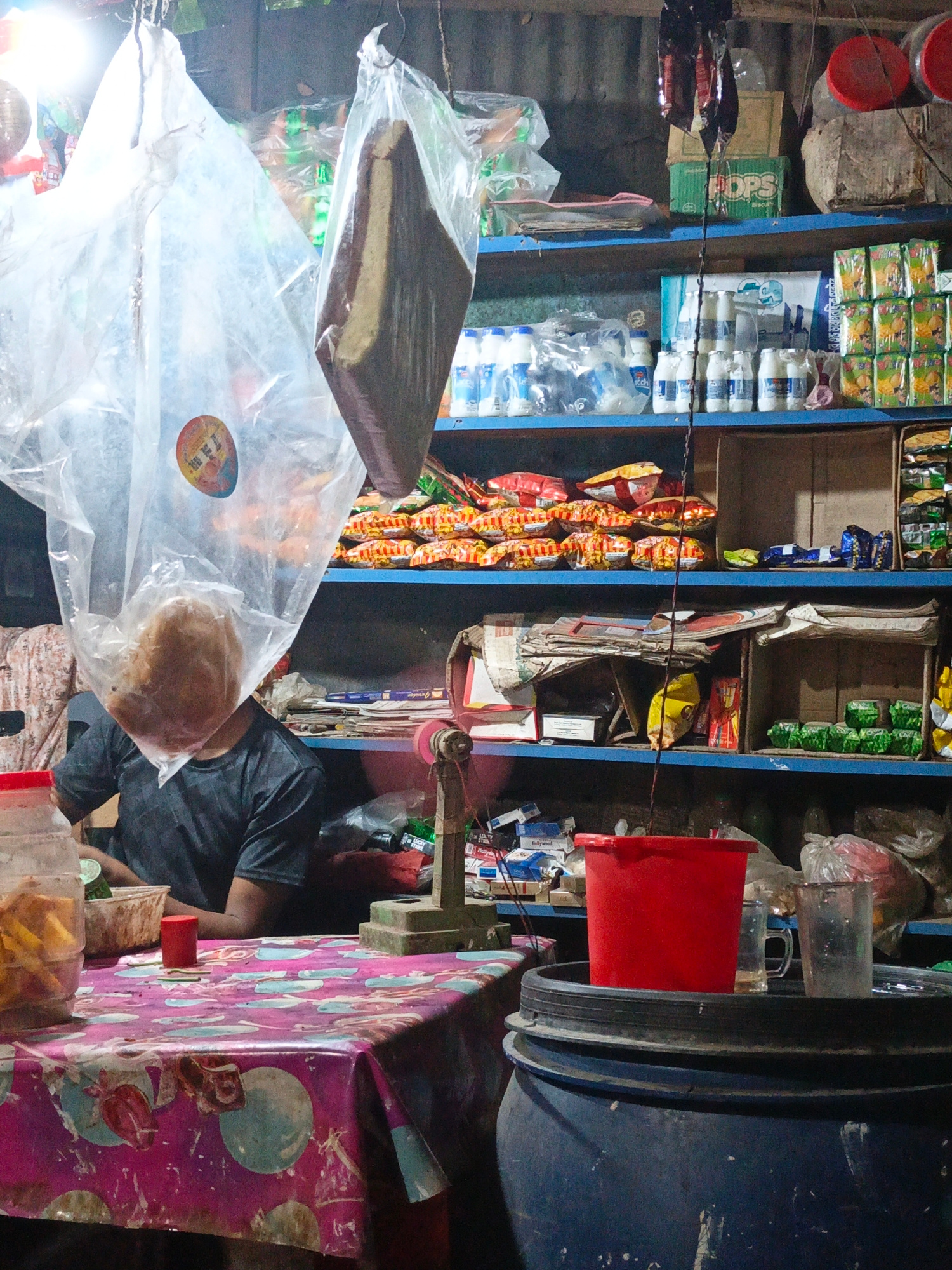 The scene is in Kauria, Bangladesh. A person in a dark t-shirt is partially visible behind a table covered with a pink tablecloth with blue and white designs. Hanging above are two clear plastic bags,…read more