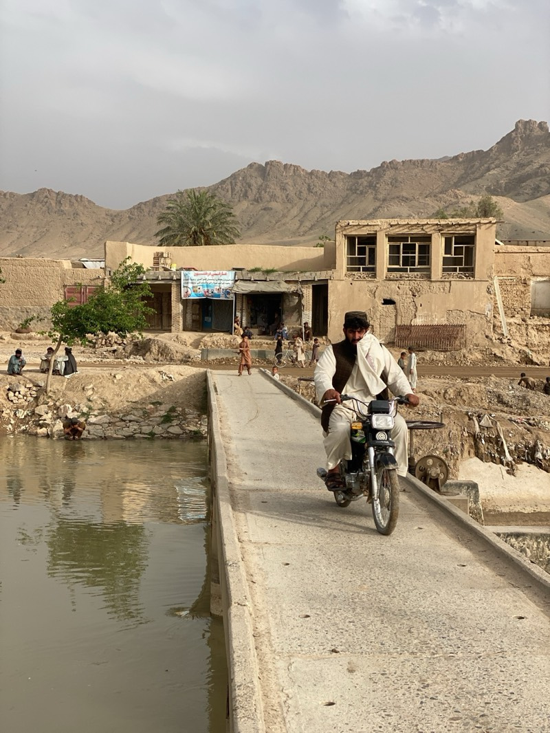 The photograph, taken in Khana Gerdab, Afghanistan, depicts a man riding a black motorcycle across a concrete bridge over a body of water. The man is wearing a light-colored traditional outfit and a h…read more