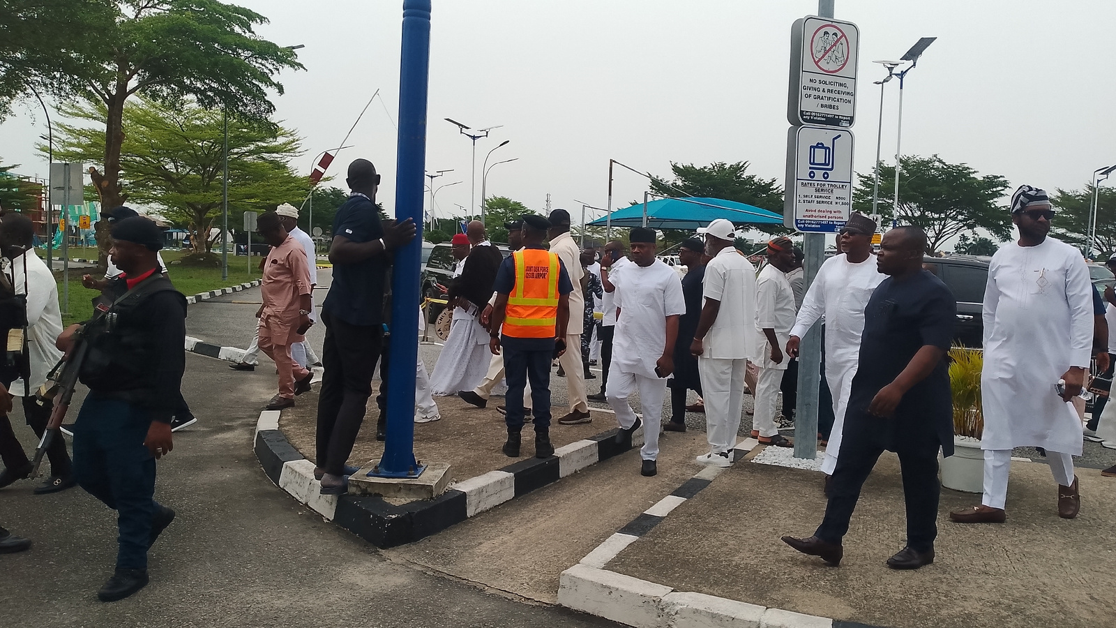 The image depicts a group of people in what appears to be an airport environment in Orerokpe, Nigeria, as indicated by the "OSUB AIRPOR" on the vest worn by a man in an orange vest. The group is diver…read more