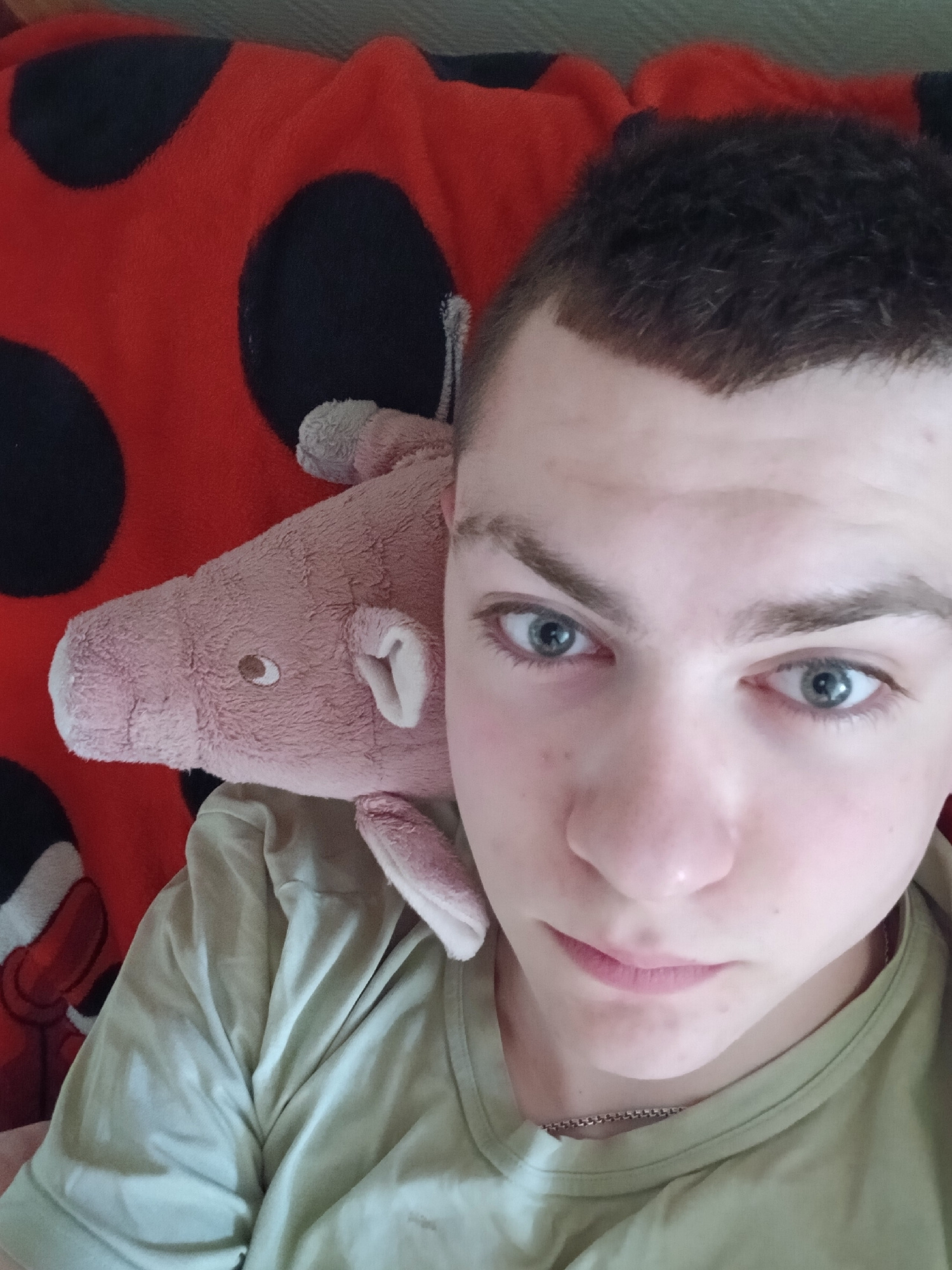 A photograph depicts a person with fair skin, short dark brown hair, and light blue eyes, lying down next to a plush pink pig toy. The person wears a light-colored shirt and a thin silver chain around…read more