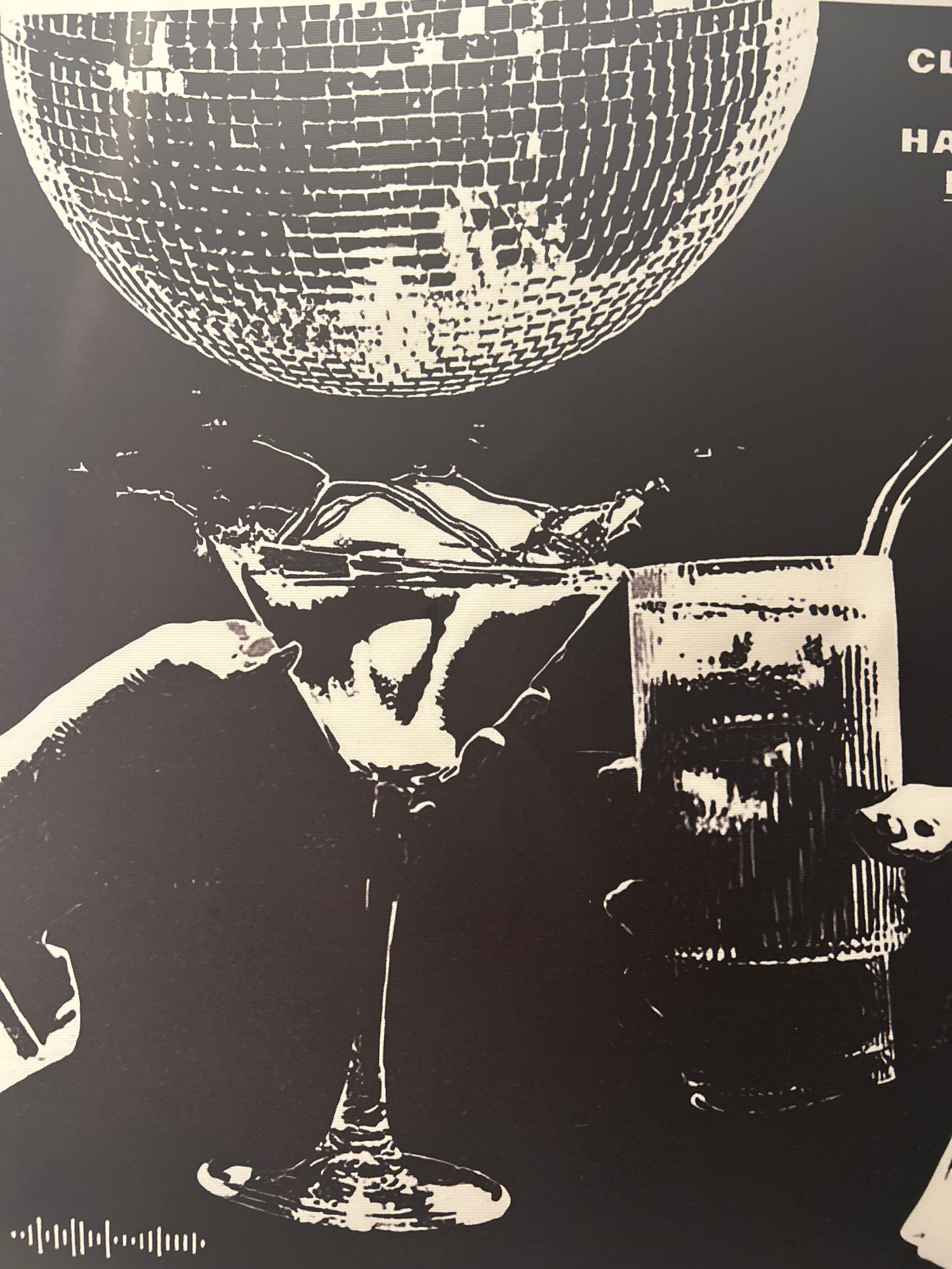 The image depicts a black and white print. On the left is a disco ball. Moving right, there appears to be a person holding a champagne flute, with a bottle nearby. The setting or location is not evide…read more