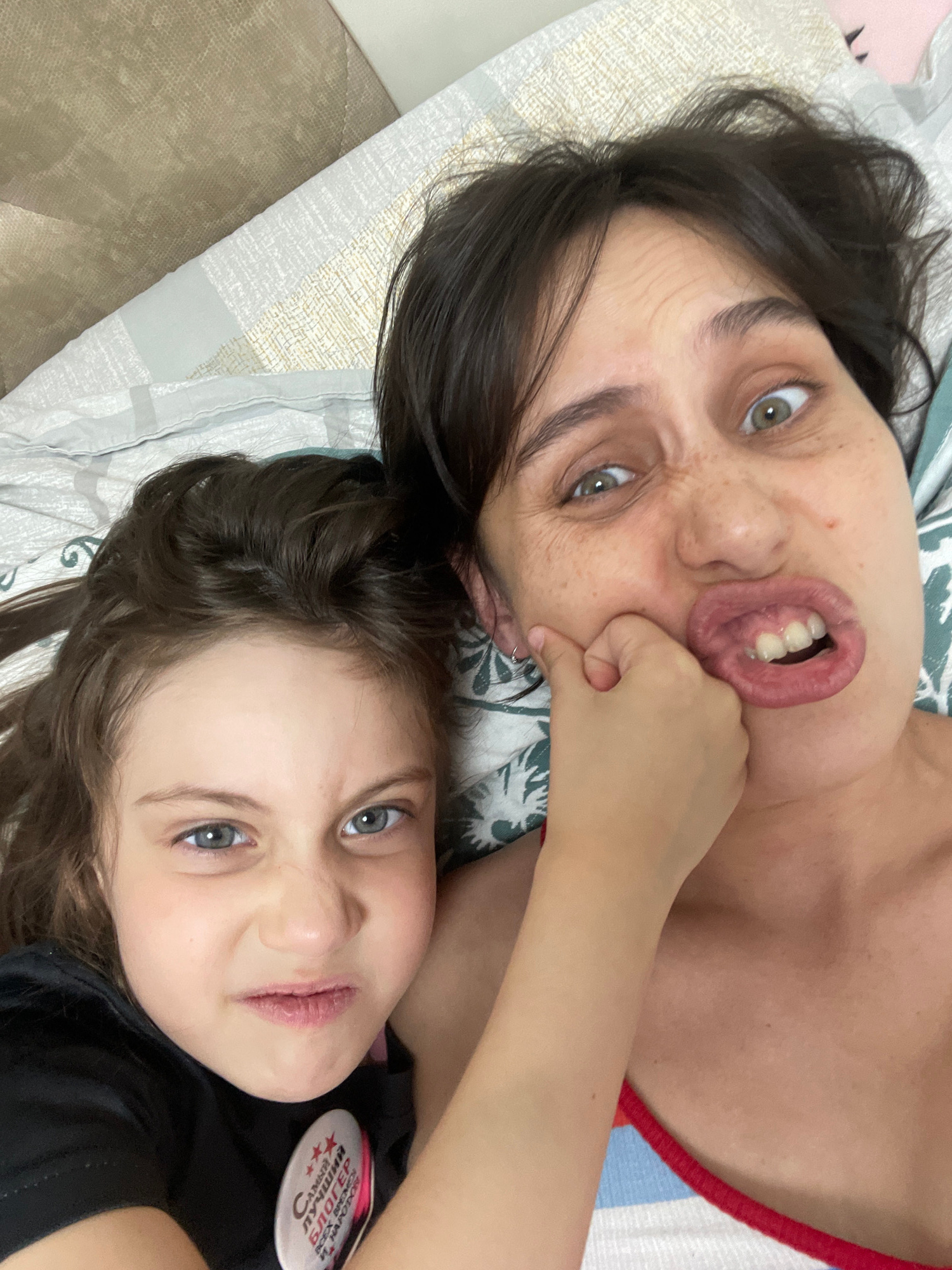 Two individuals, likely a mother and child, are lying on a bed. The adult is making a distorted facial expression while the child looks directly at the camera with a slight smirk. The location is poss…read more