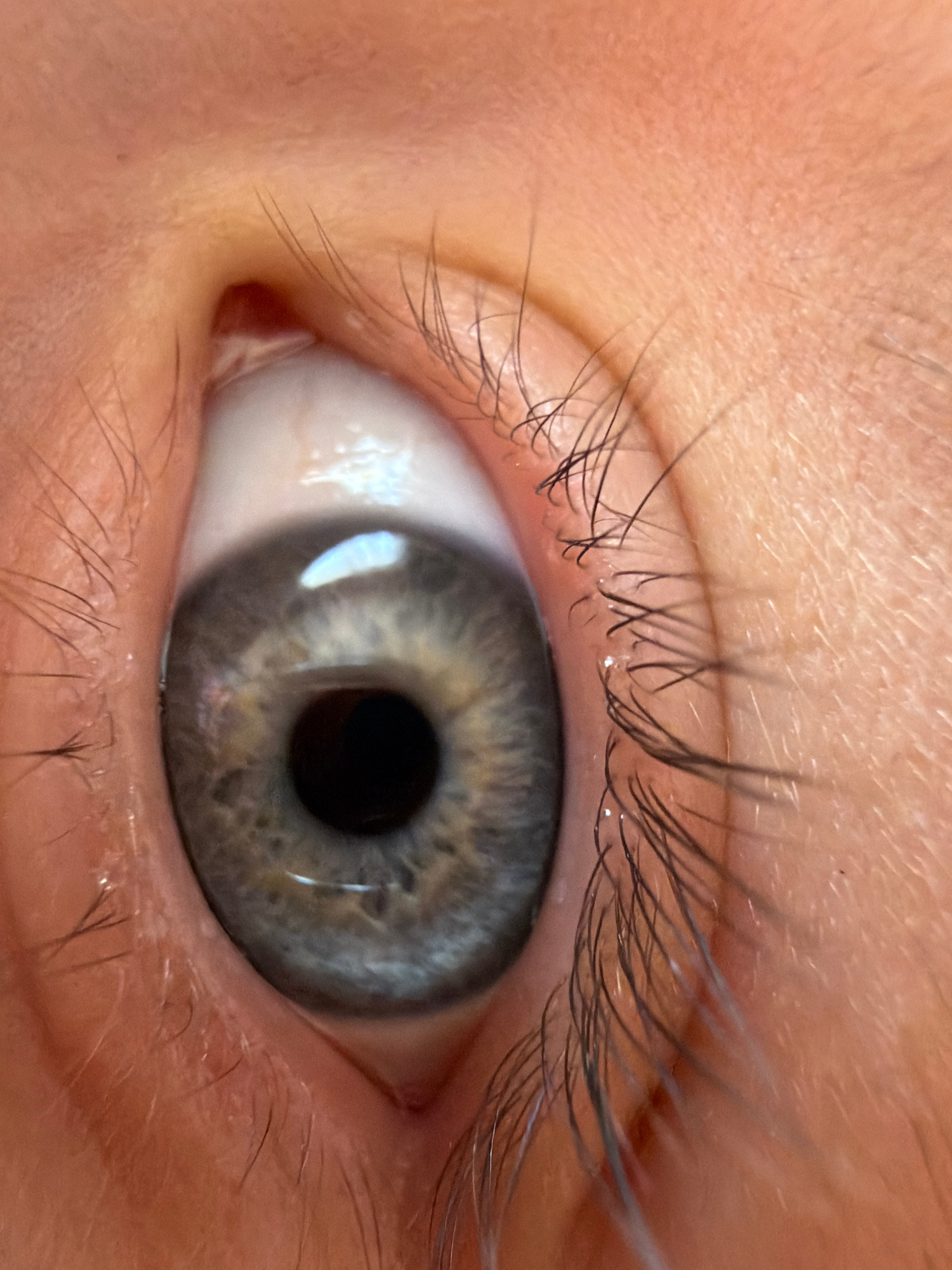 Close-up of a human eye with grey-blue iris and black pupil. The skin surrounding the eye is light pink. There are visible eyelashes both above and below the eye. The image does not provide any inform…read more