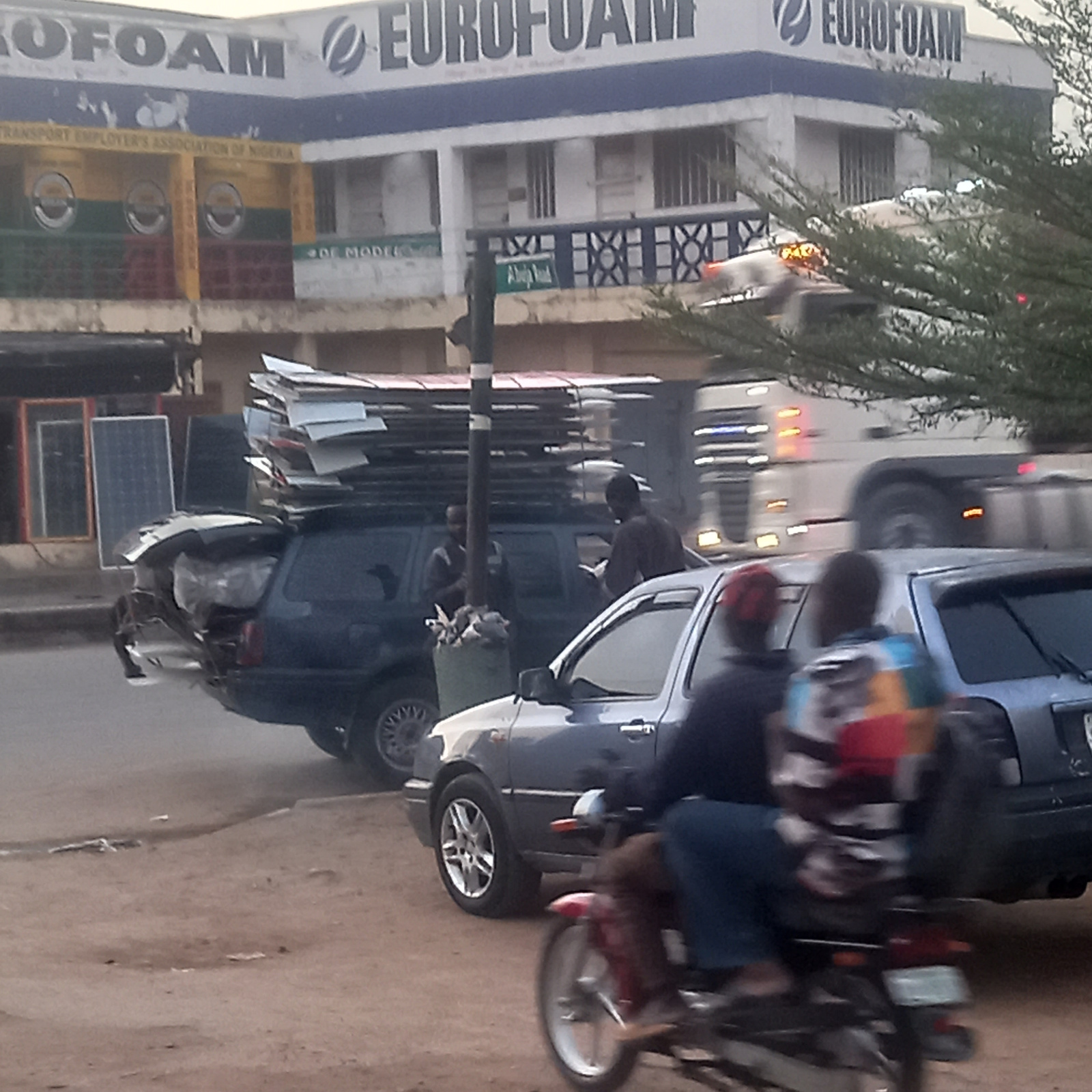 The scene is located in Sardauna, Nigeria. An "EUROFOAM" sign is visible on a building. People on a motorcycle are near a car. There are other vehicles on the road. There are also crates and other obj…read more