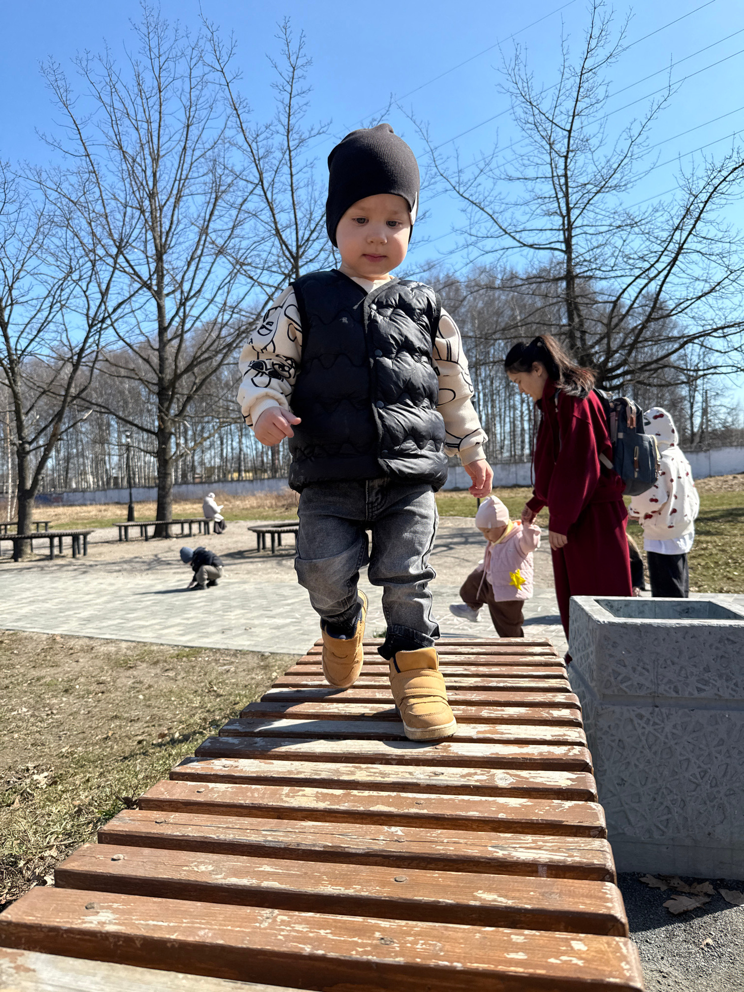 The image shows a child standing on a wooden bench in a park. The child is wearing a black beanie, a patterned white sweater, a black vest, gray pants, and tan boots. In the background, a woman in a r…read more