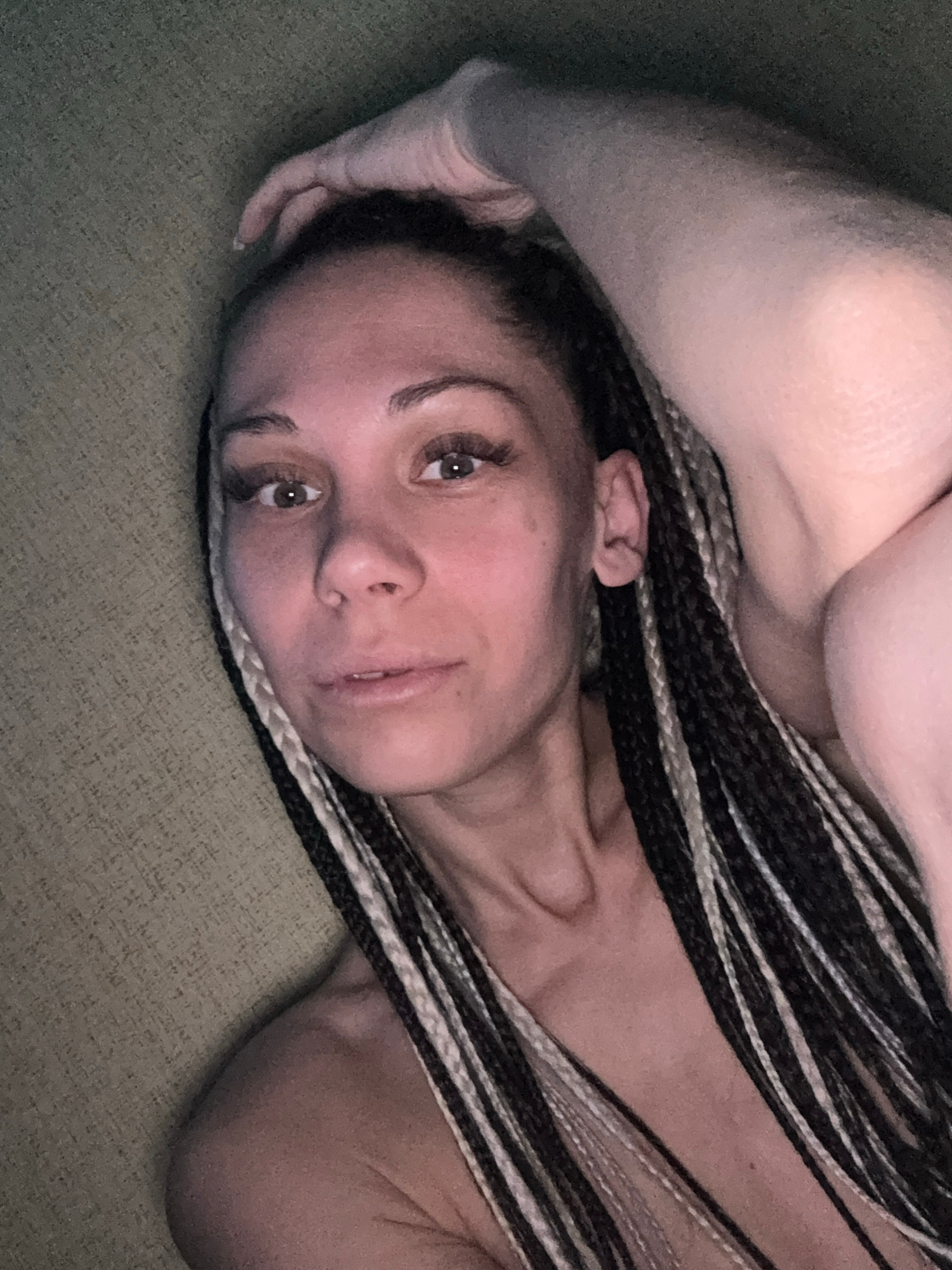 An intimate, high-angle portrait features a person, likely a woman, lying down on a soft, textured surface. Her head and upper torso are visible, positioned diagonally across the frame. She gazes dire…read more