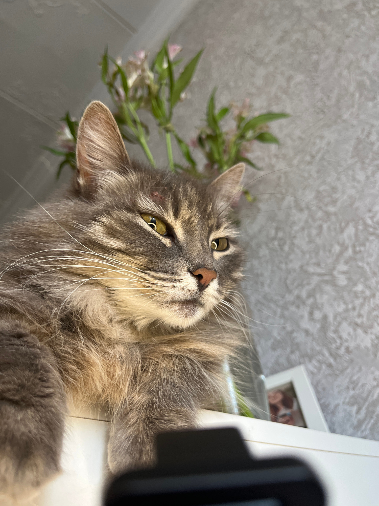 A gray, long-haired cat with green eyes is lying down. There are green plants with small pink flowers next to the cat's head. The background appears to be a textured white surface. Part of a white pic…read more