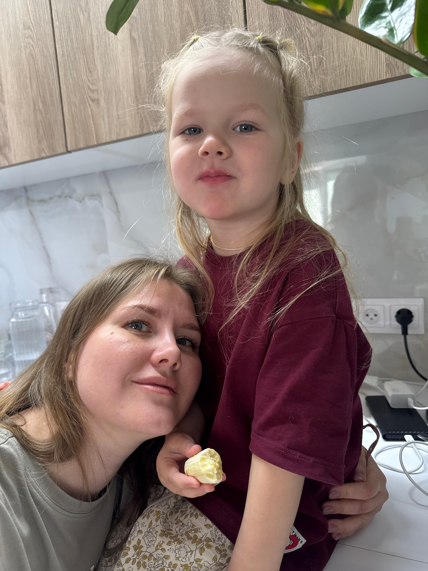 A photograph depicts a young girl and a woman, likely a mother and daughter, indoors. The girl has blonde hair styled with small hair bands, and she is wearing a burgundy shirt. The woman, who is holding a peeled banana, has light brown hair. A plant is visible in the foreground. Electrical outlets and cords are present on the wall behind them. The location appears to be inside a home, possibly a kitchen, given the cabinets. No specific details confirm the location is in Gornyi (Dvurechenskoe S/P), Russia. | Open Wire