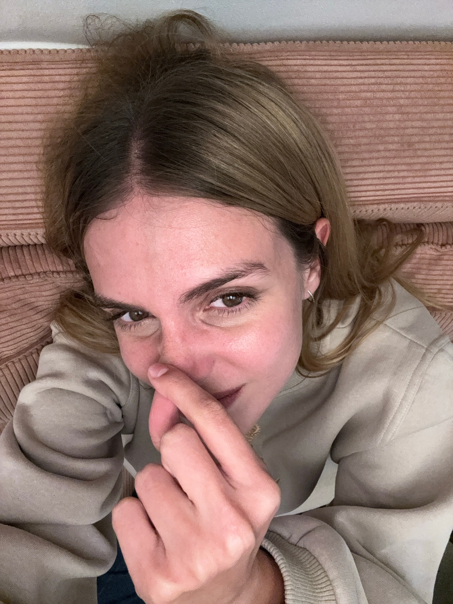 A young woman lies on a corduroy couch. She wears a beige sweatshirt. She holds her fingers to her face. The environment is indoors and appears to be a residential setting. There is no indication of T…read more