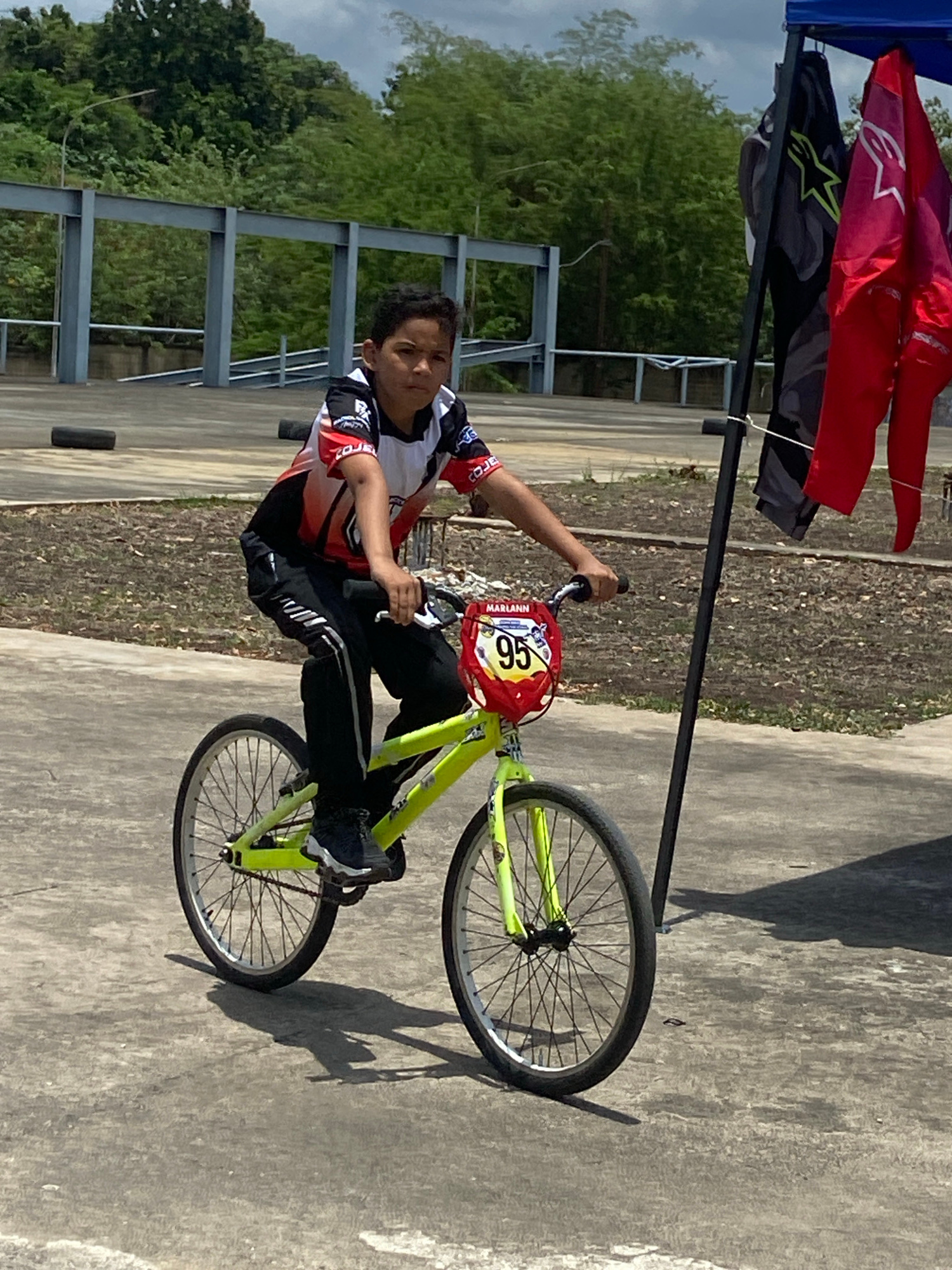 A young person rides a yellow BMX bike on a concrete surface. The person wears a red, white, and black jersey, black pants with a white stripe, and black shoes. The bike has a red number plate with th…read more