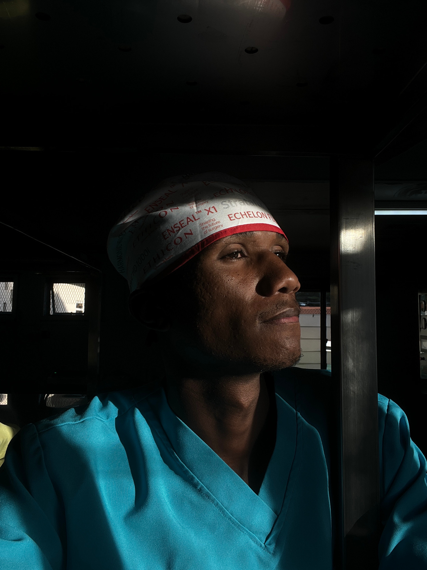 A close-up, low-angle shot depicts a dark-skinned man in a medical setting. He is dressed in turquoise scrubs and a white surgical cap with the words "ECHELON" and "ENSEAL" in red lettering. The man i…read more