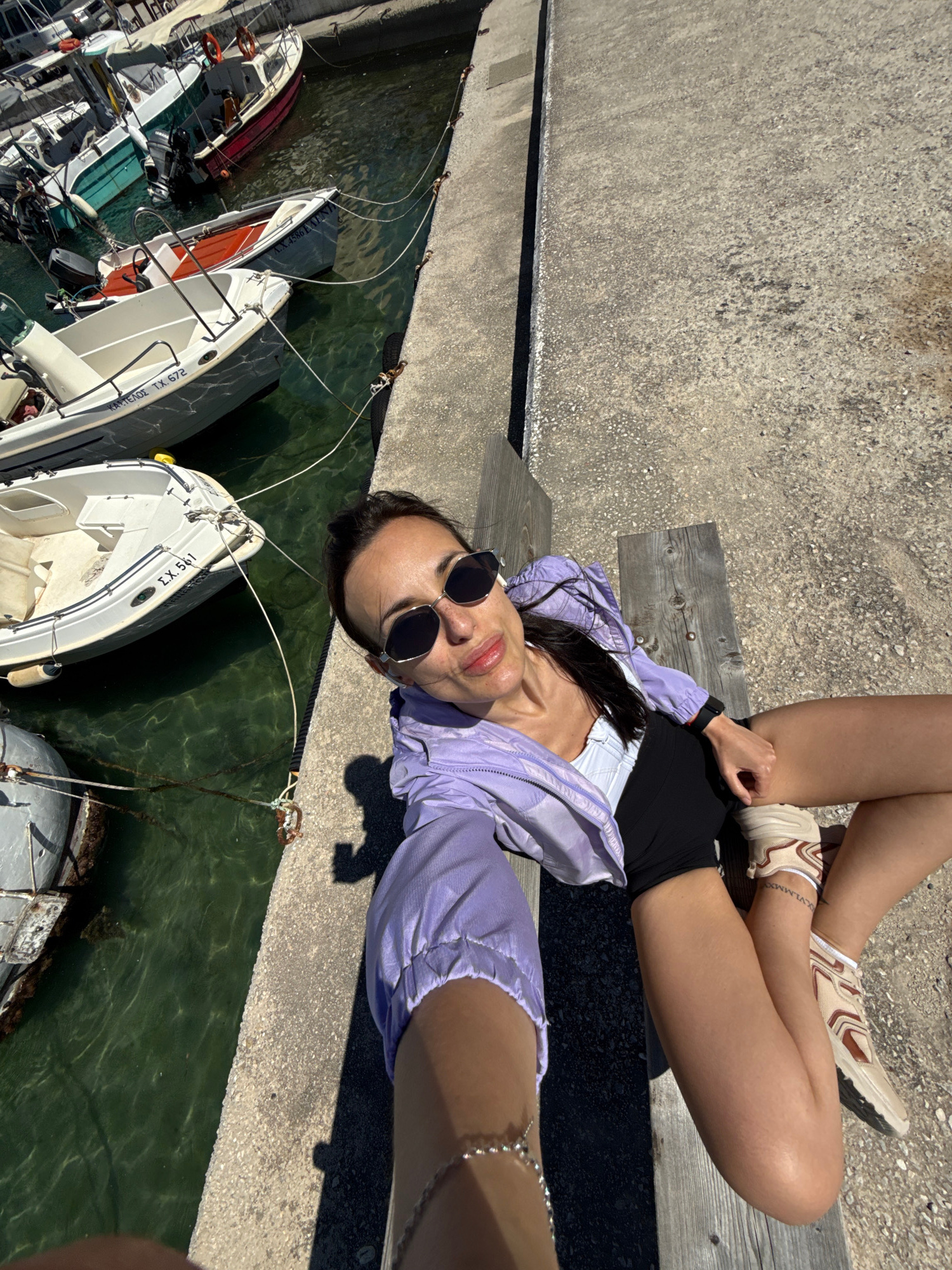 A woman is lying on a wooden bench adjacent to a waterfront in Chania, Greece. She is wearing black shorts, a white top, a lavender jacket, sunglasses, and sneakers with light-colored socks. Her legs…read more
