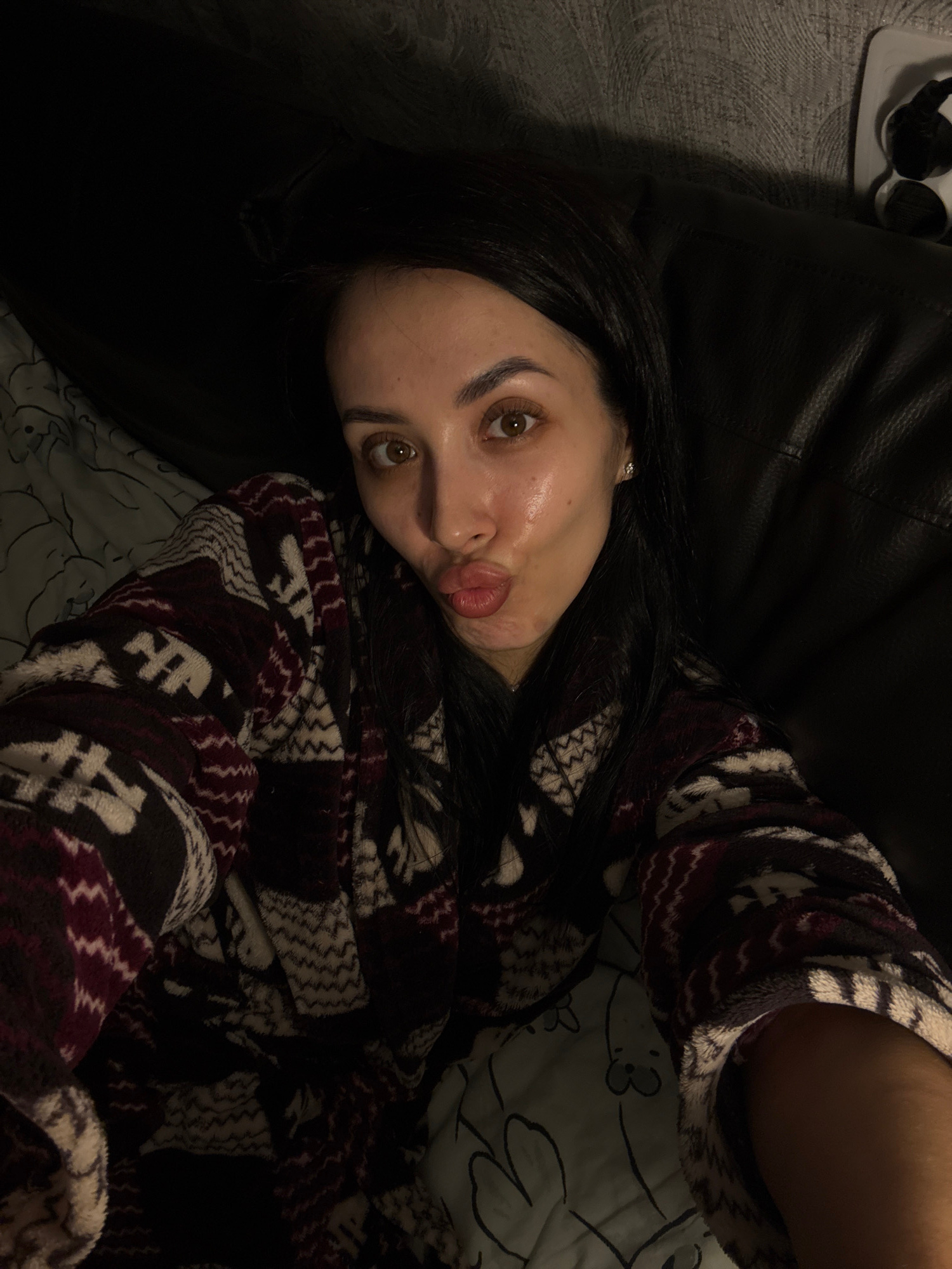 A selfie photograph presents a woman lying down in what appears to be an indoor setting, potentially a residence. She has dark hair and brown eyes, and is wearing a patterned robe or sweater. She is m…read more
