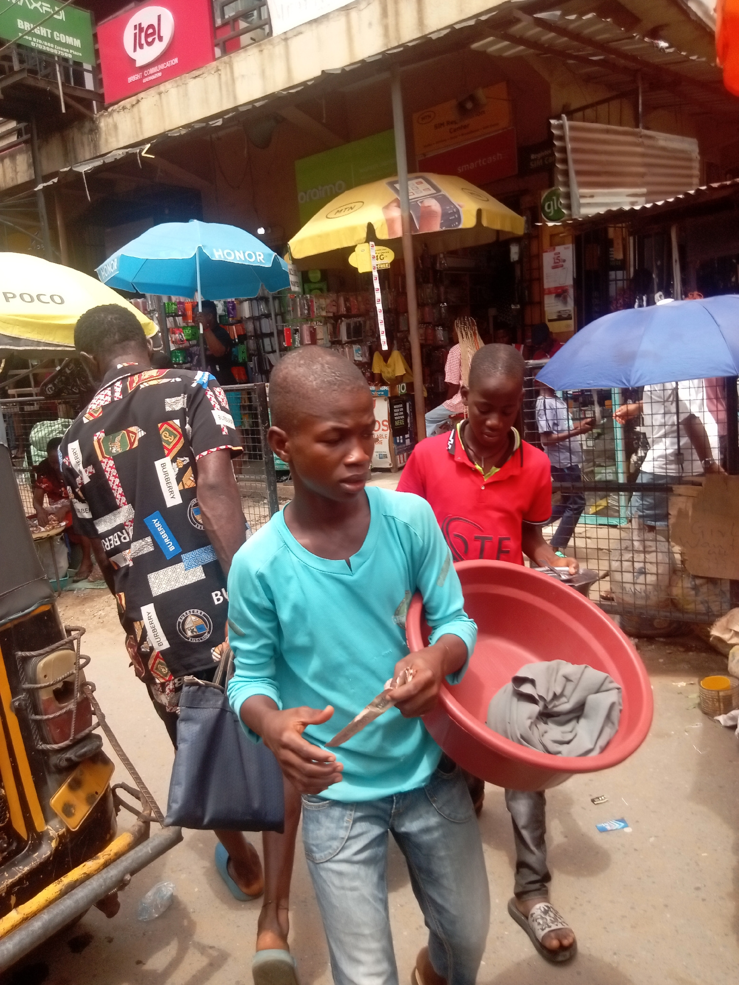 This image depicts a bustling street market scene in Fegge, Nigeria, likely during the daytime. The bright lighting and numerous umbrellas (blue "HONOR," yellow "POCO," and yellow "MTN") suggest sunny…read more