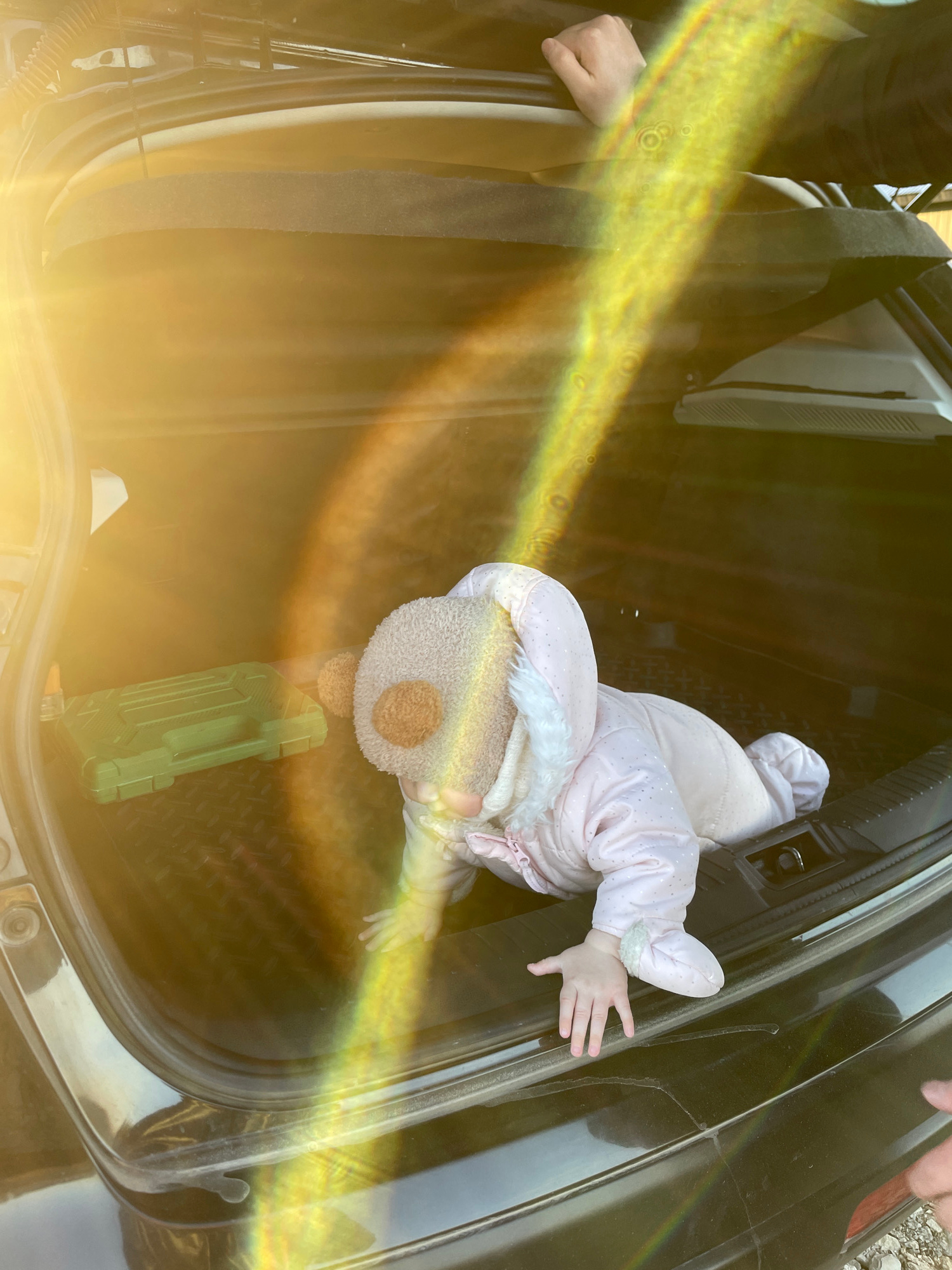 The image depicts a baby or toddler playfully interacting within the open trunk of a black car. The child is dressed in a light pink padded suit adorned with white fur trim and a charming teddy bear-s…read more