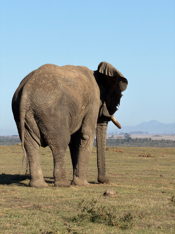An adult African elephant stands in an open, grassy field under a clear blue sky in the city of Hessequa Nu, South Africa. The elephant is positioned with its back and right flank towards the viewer,…read more