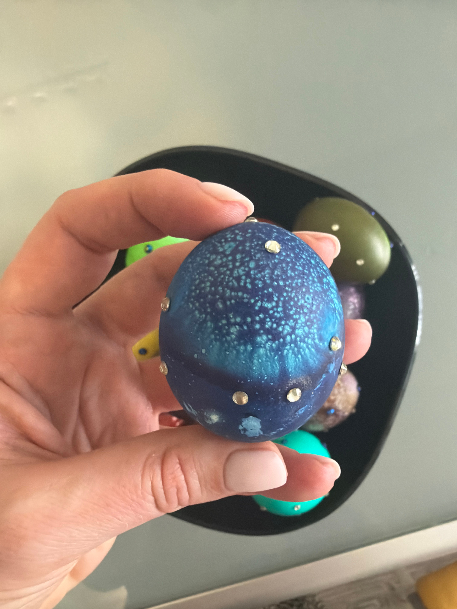 A hand holds a blue, speckled, ornamented egg in front of a black bowl filled with similarly decorated eggs in various colors. The background is out of focus, revealing a gray surface and a white obje…read more