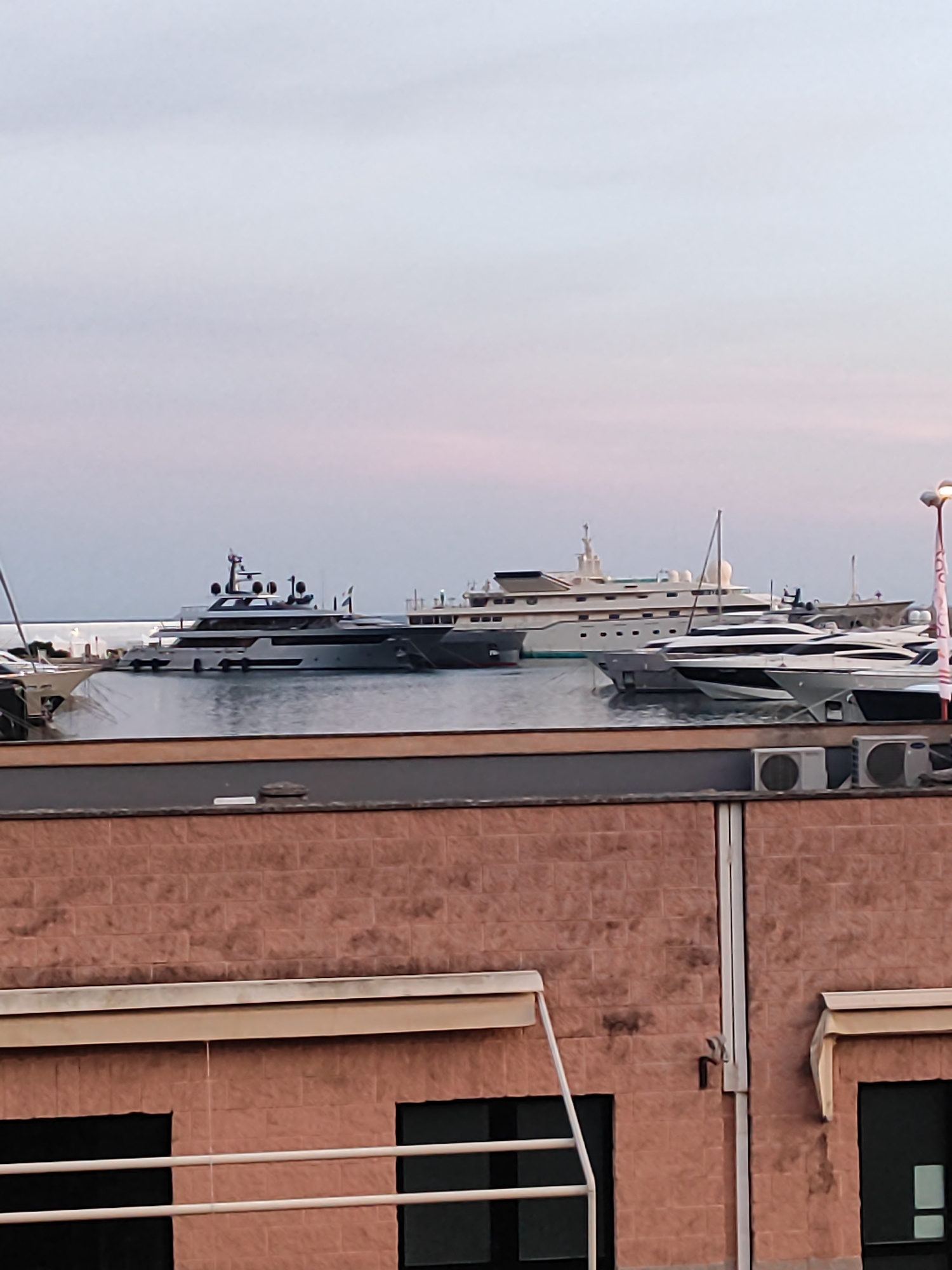 The scene is a view of the harbor in Sanremo, Italy, taken from an elevated position above a building. Three large yachts are docked in the harbor, dominating the midground of the image. The yacht on…read more