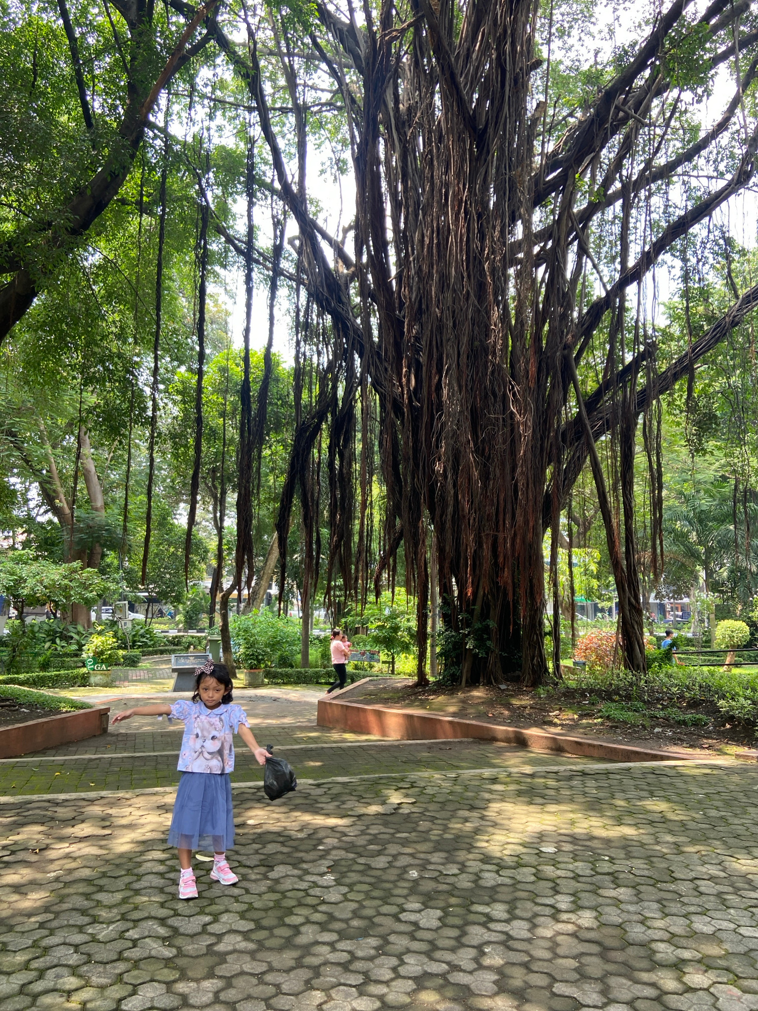 The image displays a bright, sunny daytime scene in a lush tropical park, consistent with the context of Surabaya, Indonesia. A young girl stands on a paved pathway, posing for the camera with a neutr…read more