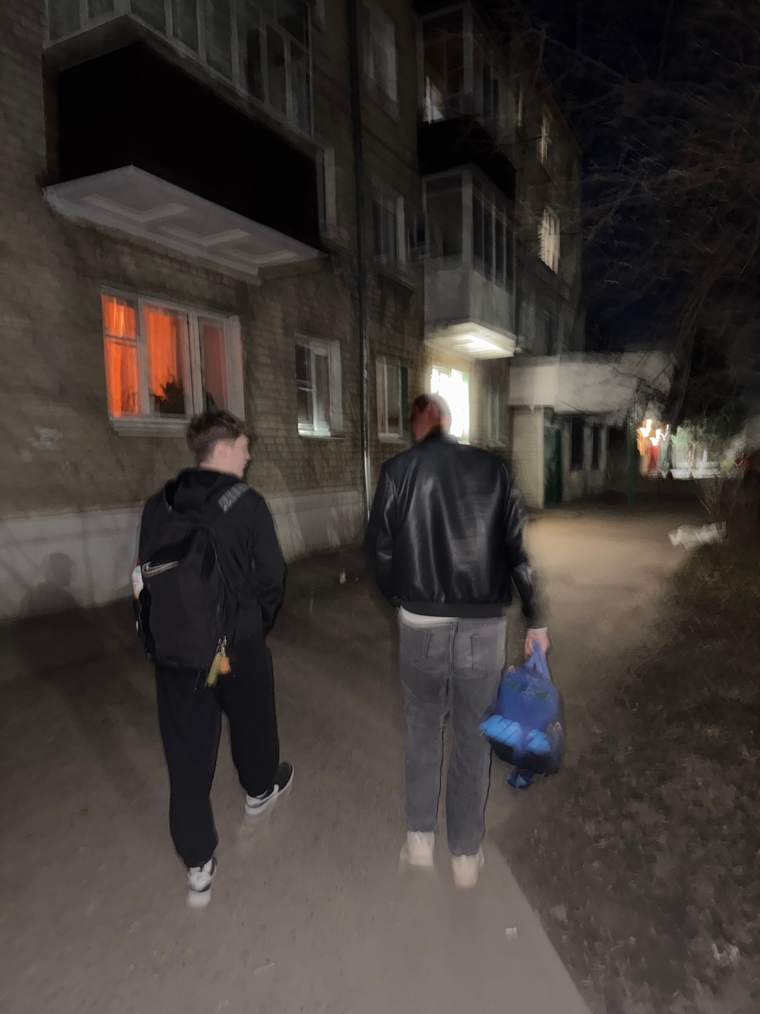 The image captures a blurry, low-light outdoor scene at night in Kazan, Russia, depicting two individuals walking along a paved urban path. The image appears rotated 90 degrees counter-clockwise from…read more