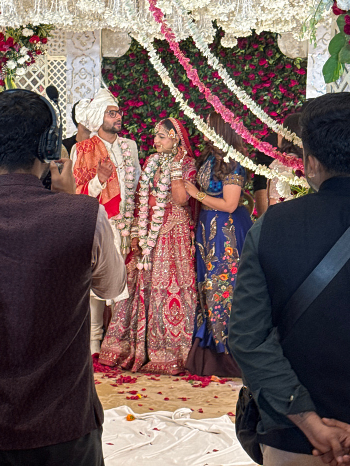 This image captures a vibrant moment from what appears to be an Indian wedding ceremony, seen from an elevated perspective looking down. The photo is rotated 90 degrees clockwise, so the scene is desc…read more