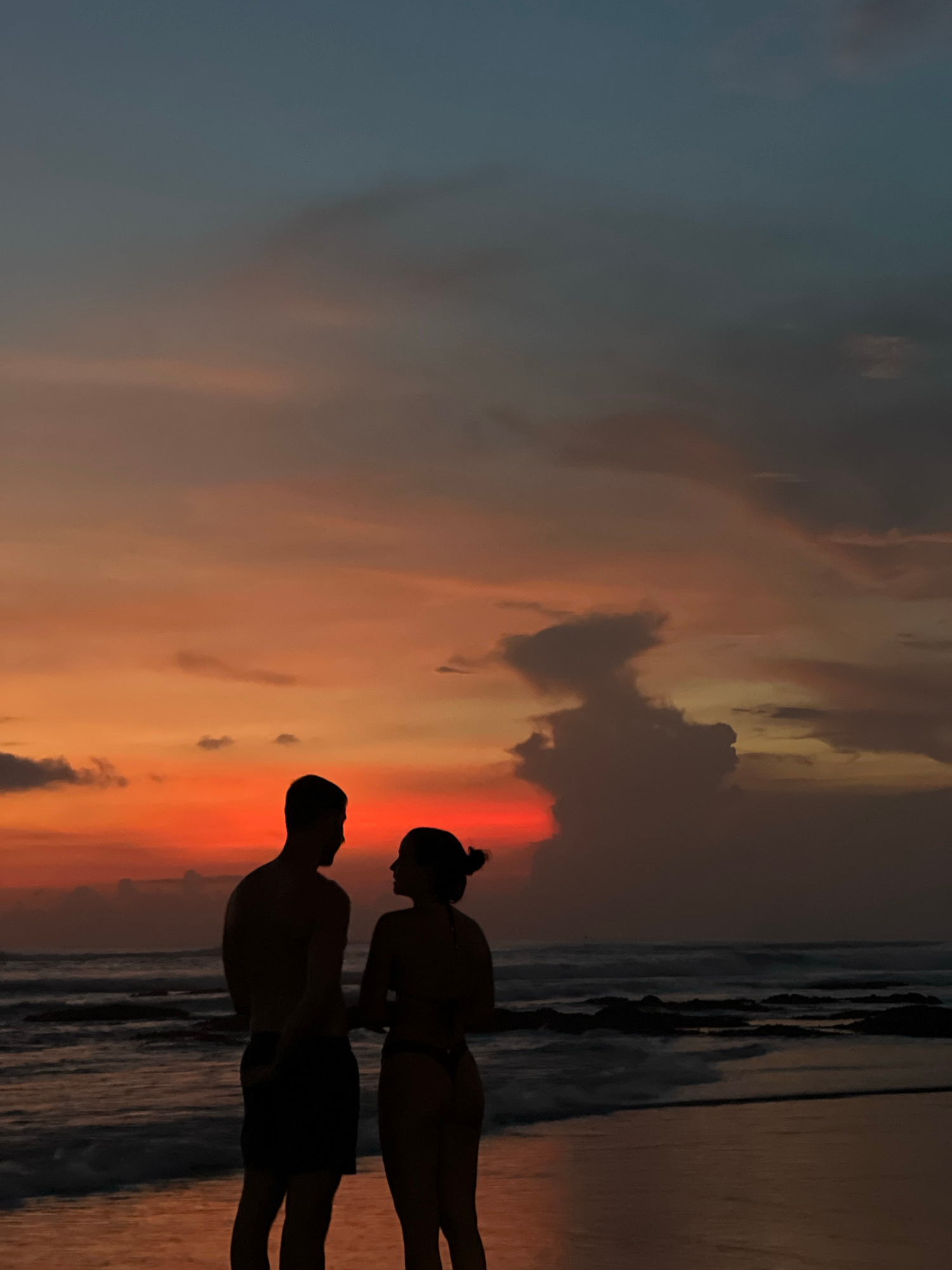A vertical composition captures the silhouette of a couple standing on a beach, with a vibrant sunset dominating the background. The sky transitions from a dark, possibly stormy gray on the left to fi…read more