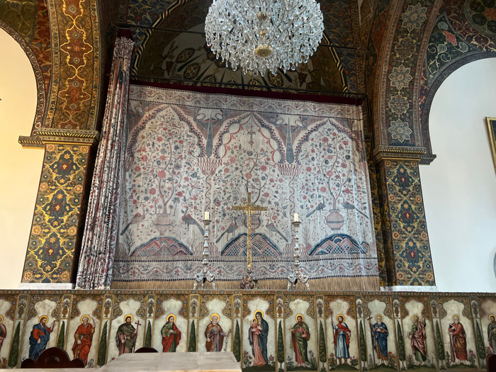 The image displays a richly decorated interior of a religious structure in Vagharshapat, Armenia, likely within the Mother See of Holy Etchmiadzin. The central feature is a large rectangular textile t…read more