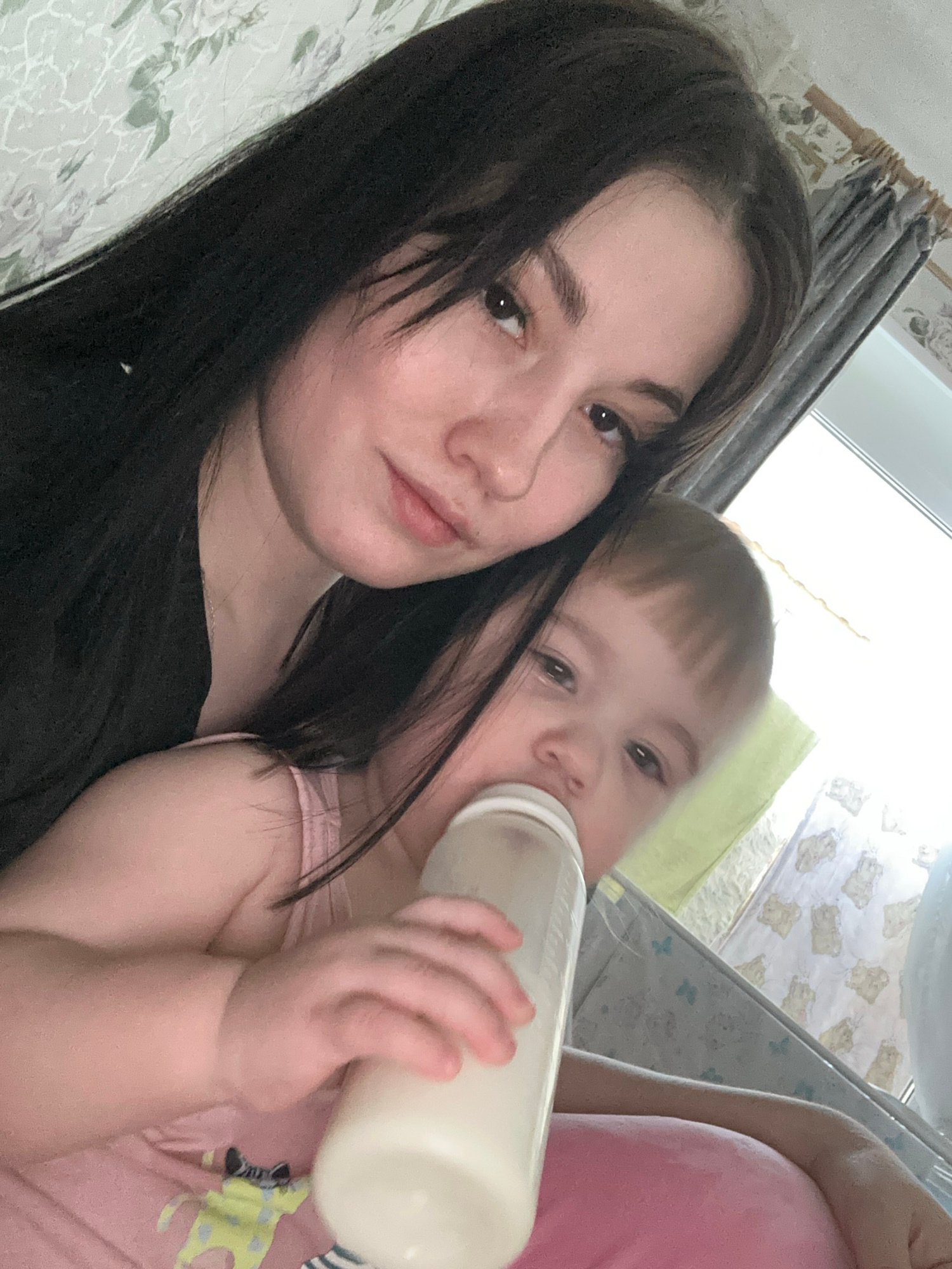 The image is a selfie of a woman with long, dark hair posing with a toddler who is drinking from a baby bottle. The background shows a curtain and bedding with a light-colored floral pattern. The phot…read more