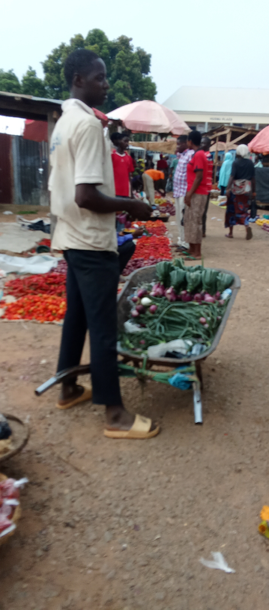 The image depicts a market scene in Akwanga, Nigeria. A man stands next to a wheelbarrow filled with vegetables, including onions and leafy greens. In the background, other vendors and customers are vā¦read more