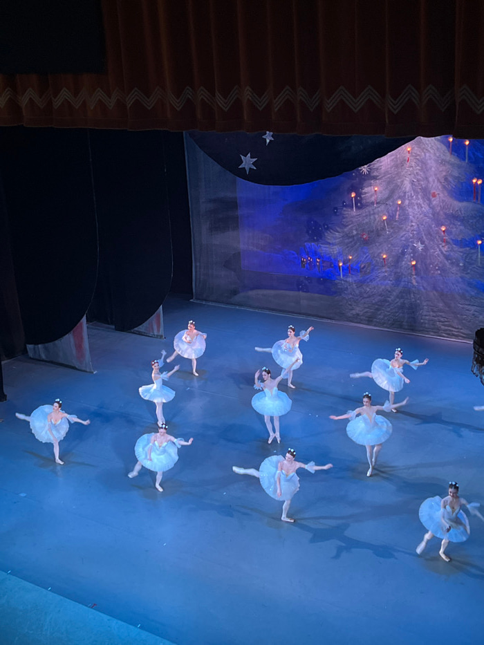 A ballet performance unfolds on stage under blue lighting. Numerous ballerinas in white tutus are arranged in a pattern. The stage backdrop depicts a wintery scene with a decorated tree and sparkling…read more