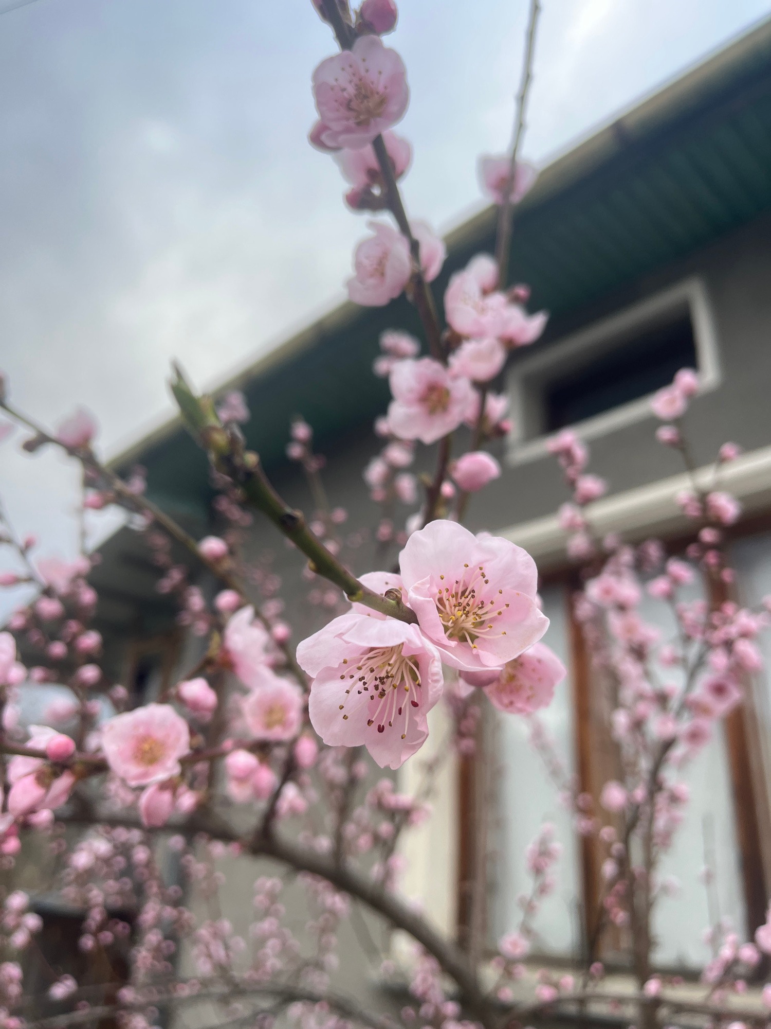 Close-up view of pink flowers on a tree branch, possibly plum blossoms, in Apriltsi, Bulgaria. The background includes a building with a grey roof and window. The sky is overcast. The focus is on theβ¦read more