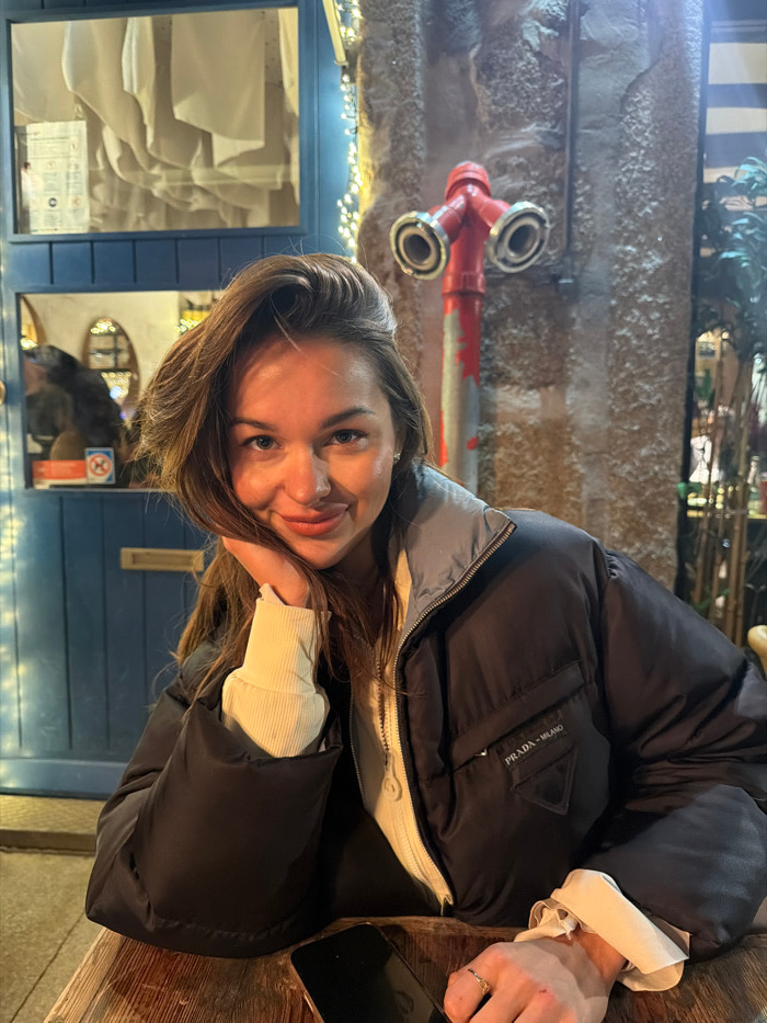 A woman smiles while seated at a wooden table outside. She wears a black puffer jacket with a white ribbed undershirt. The jacket has a Prada logo on the chest. A smartphone lies on the table beside h…read more