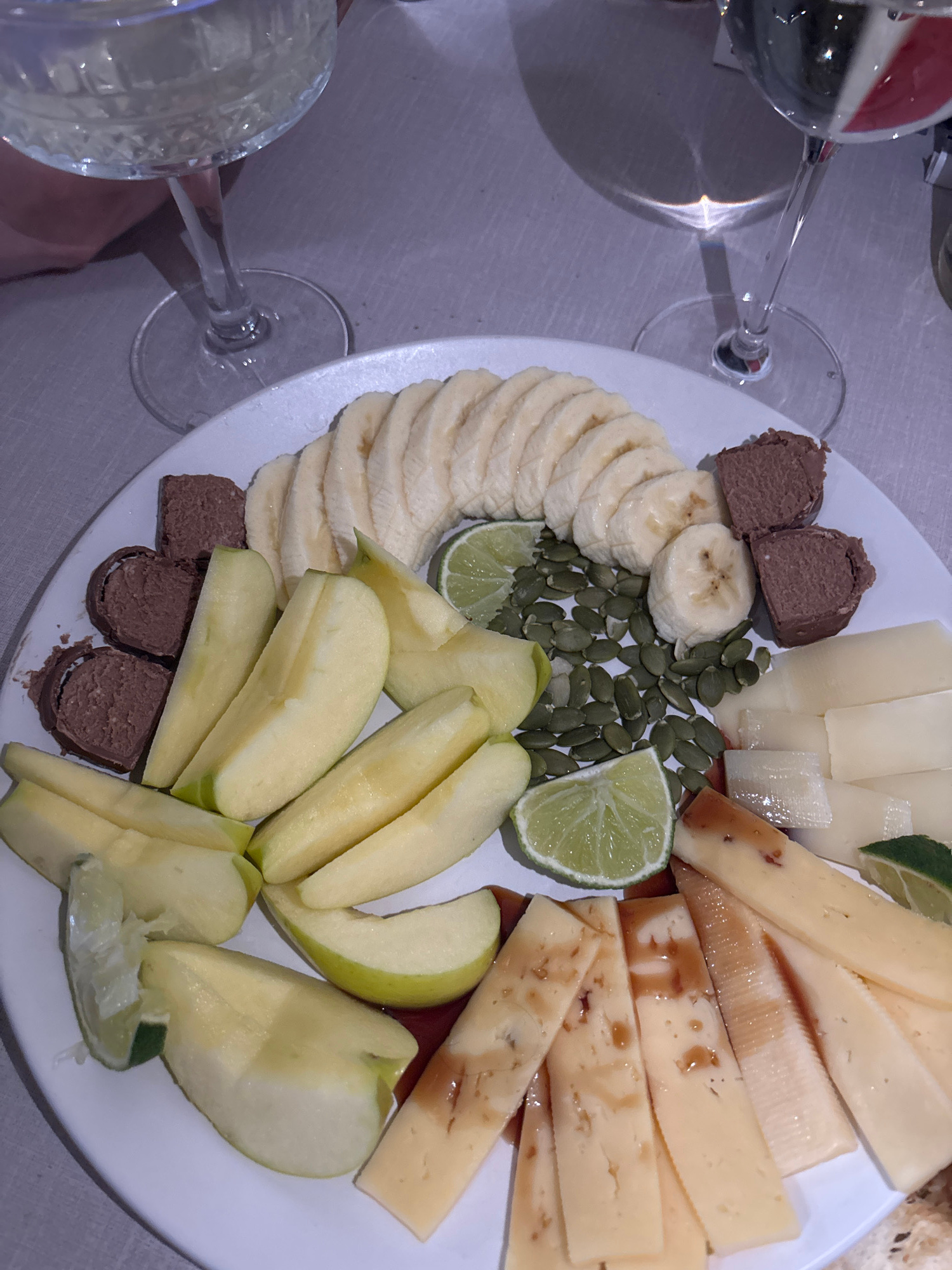 The image displays a top-down view of a white round plate filled with various snacks, accompanied by two stemmed glasses. The setting appears to be indoors, likely a dining table, under artificial lig…read more